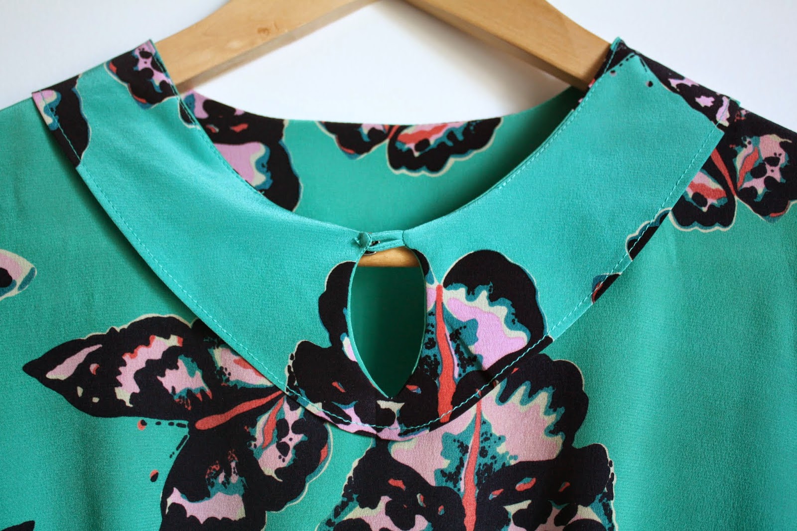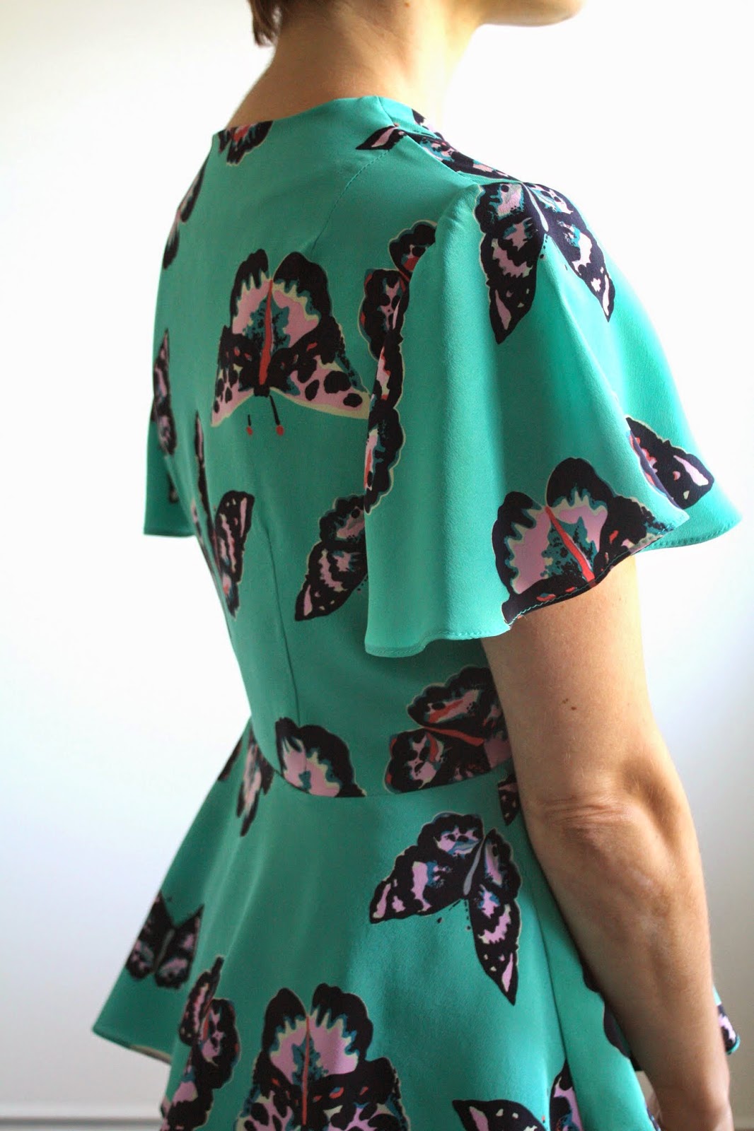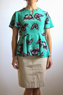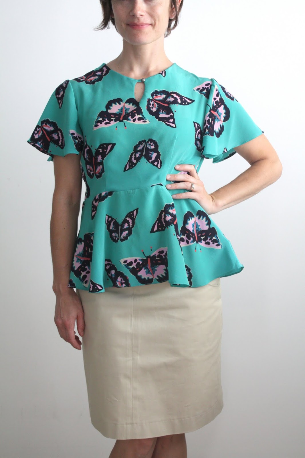 this is similar) really directed the design of the top–flutter sleeves (‘circle sleeves’, according to my textbook) and a flouncy peplum, with a nod to the vintage. To liven up the neckline a bit, I added a keyhole feature, with self loop and button: