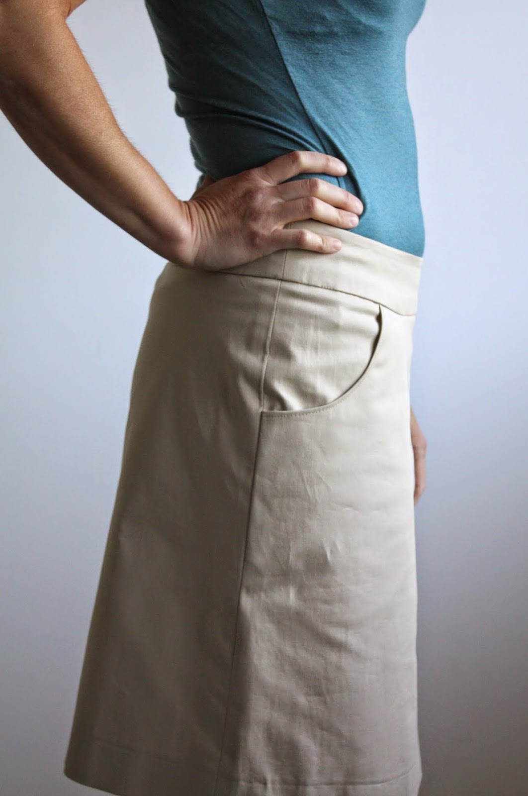 tretch cotton khaki fabric since I really needed this particular basic. To be truthful, it is not very exciting–just a basic, low waist skirt with a contoured waistband, four panels, pockets and a side zip. What it lacks in interest, it makes up in practicality! Ha!