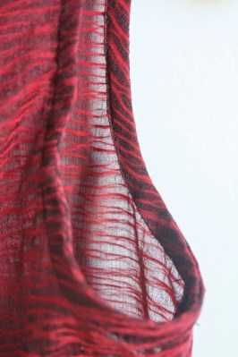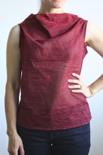 When scanning my syllabus at the start of the pattern making course I took last semester, I was most excited about learning how to draft cowl neck tops. When we finally got to it toward the end of the course, I was surprised how simple they actually were! Using a basic bodice sloper, it’s just a matter of lowering the neckline and slash and spreading to create fullness. The self-facing in the front keeps it pretty no matter how the cowl falls! Clearly, putting my new knowledge to use was in the forefront of my mind when I had the opportunity to use one of the fabrics from the Novelty category at Britex. This unusual ruby and black sheer viscose fabric seemed like a fun and modern choice for a fairly classic cowl shape.