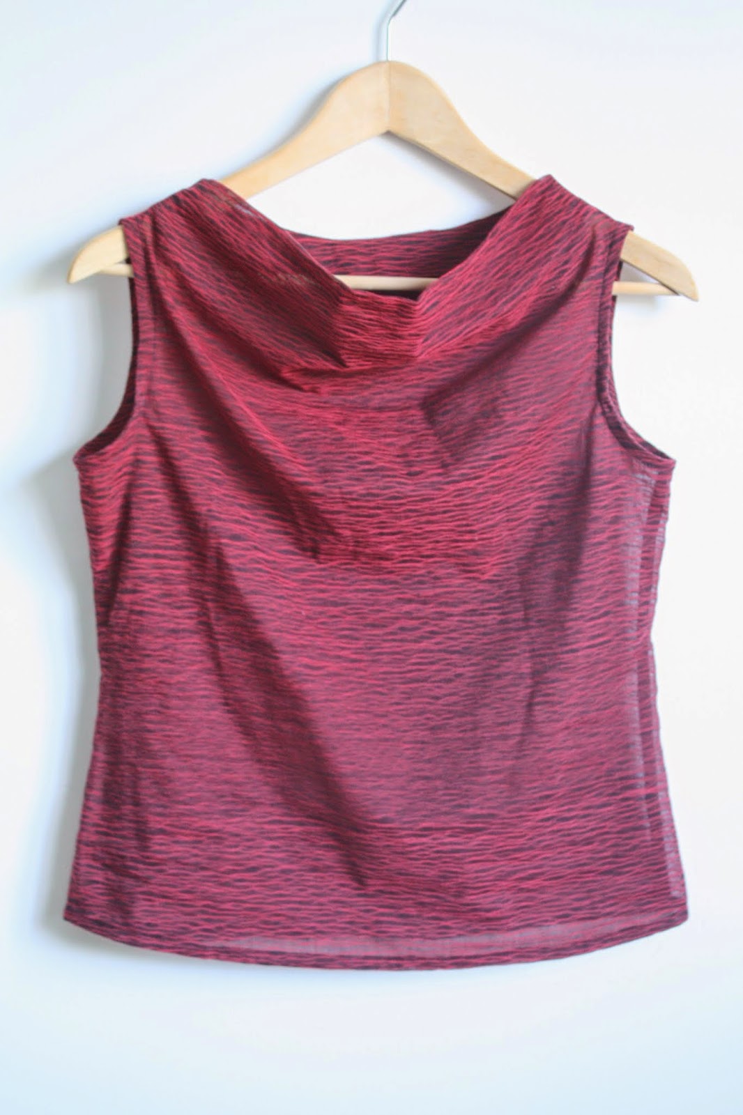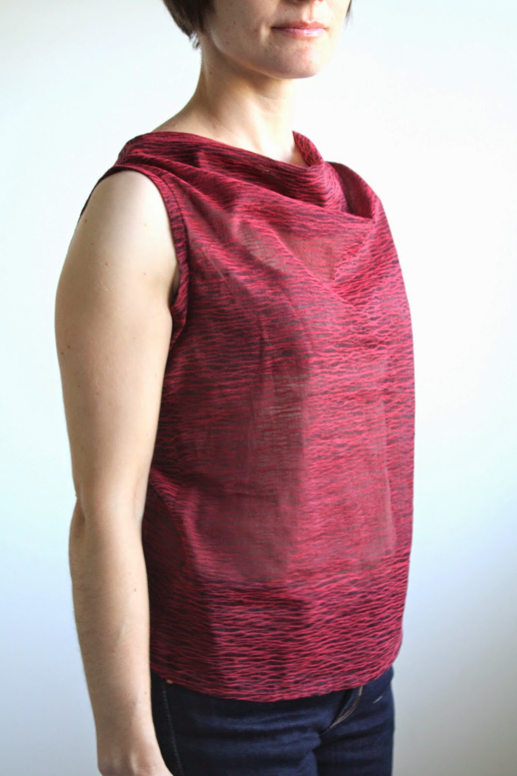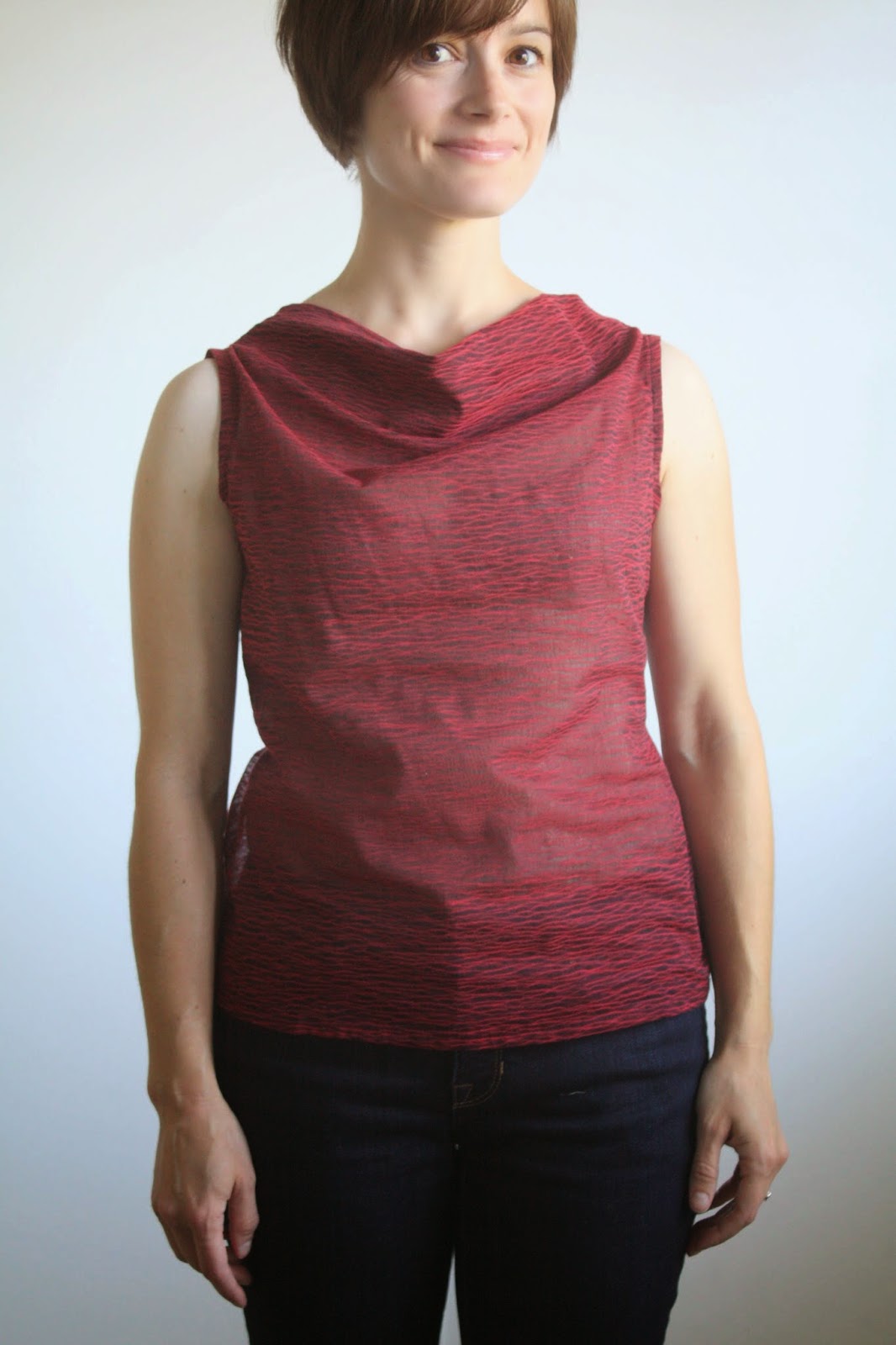 When scanning my syllabus at the start of the pattern making course I took last semester, I was most excited about learning how to draft cowl neck tops. When we finally got to it toward the end of the course, I was surprised how simple they actually were! Using a basic bodice sloper, it’s just a matter of lowering the neckline and slash and spreading to create fullness. The self-facing in the front keeps it pretty no matter how the cowl falls! Clearly, putting my new knowledge to use was in the forefront of my mind when I had the opportunity to use one of the fabrics from the Novelty category at Britex. This unusual ruby and black sheer viscose fabric seemed like a fun and modern choice for a fairly classic cowl shape.