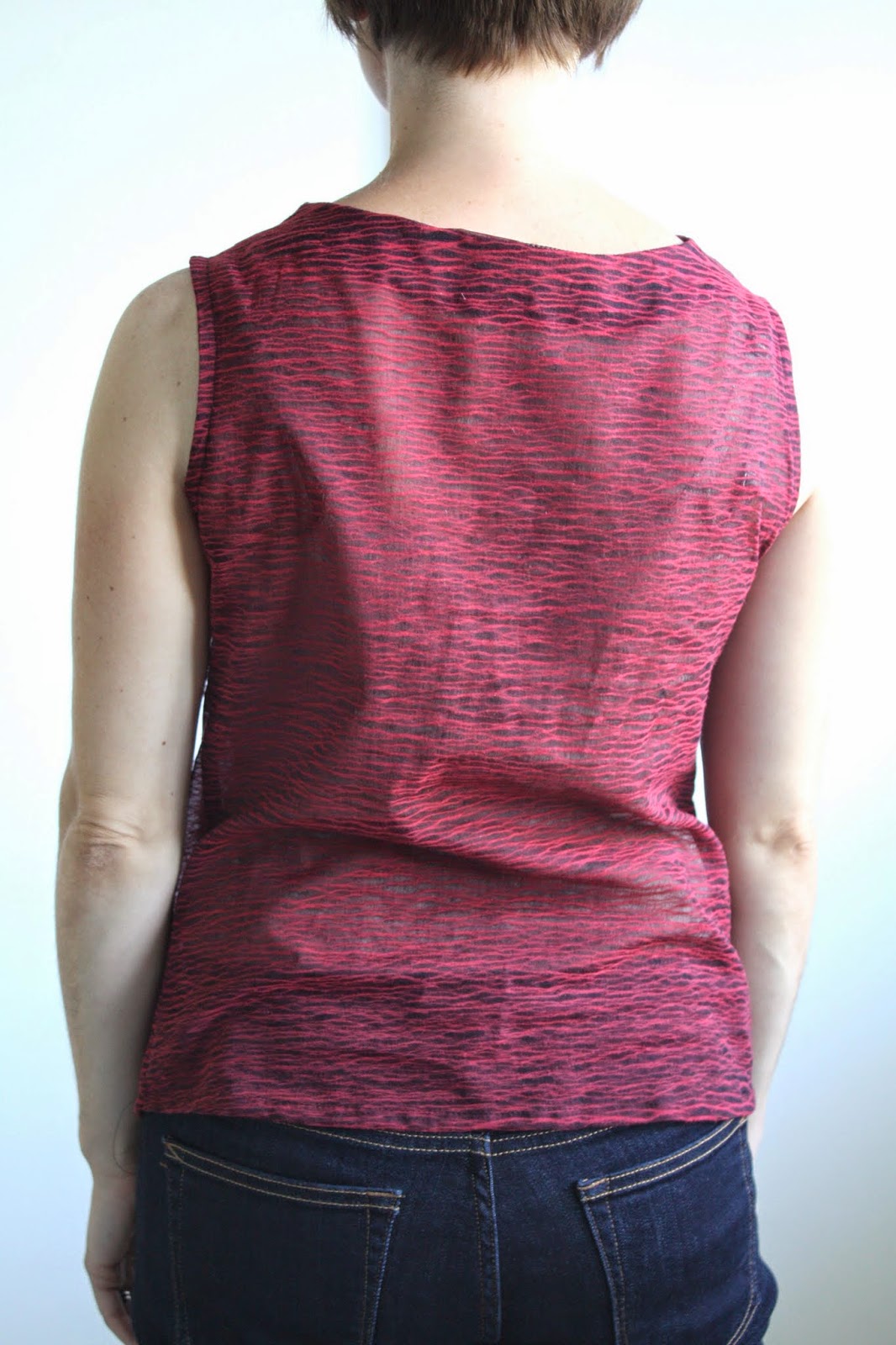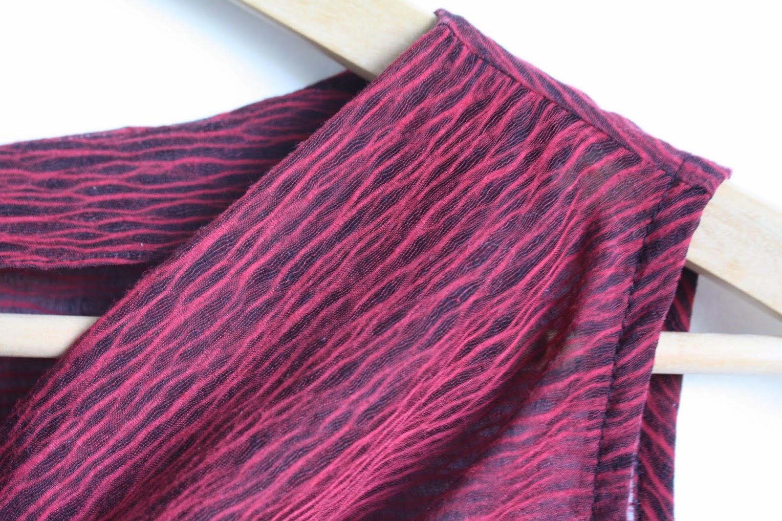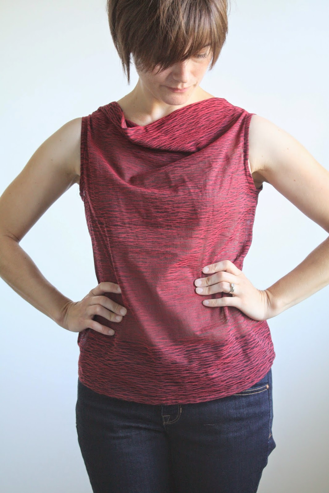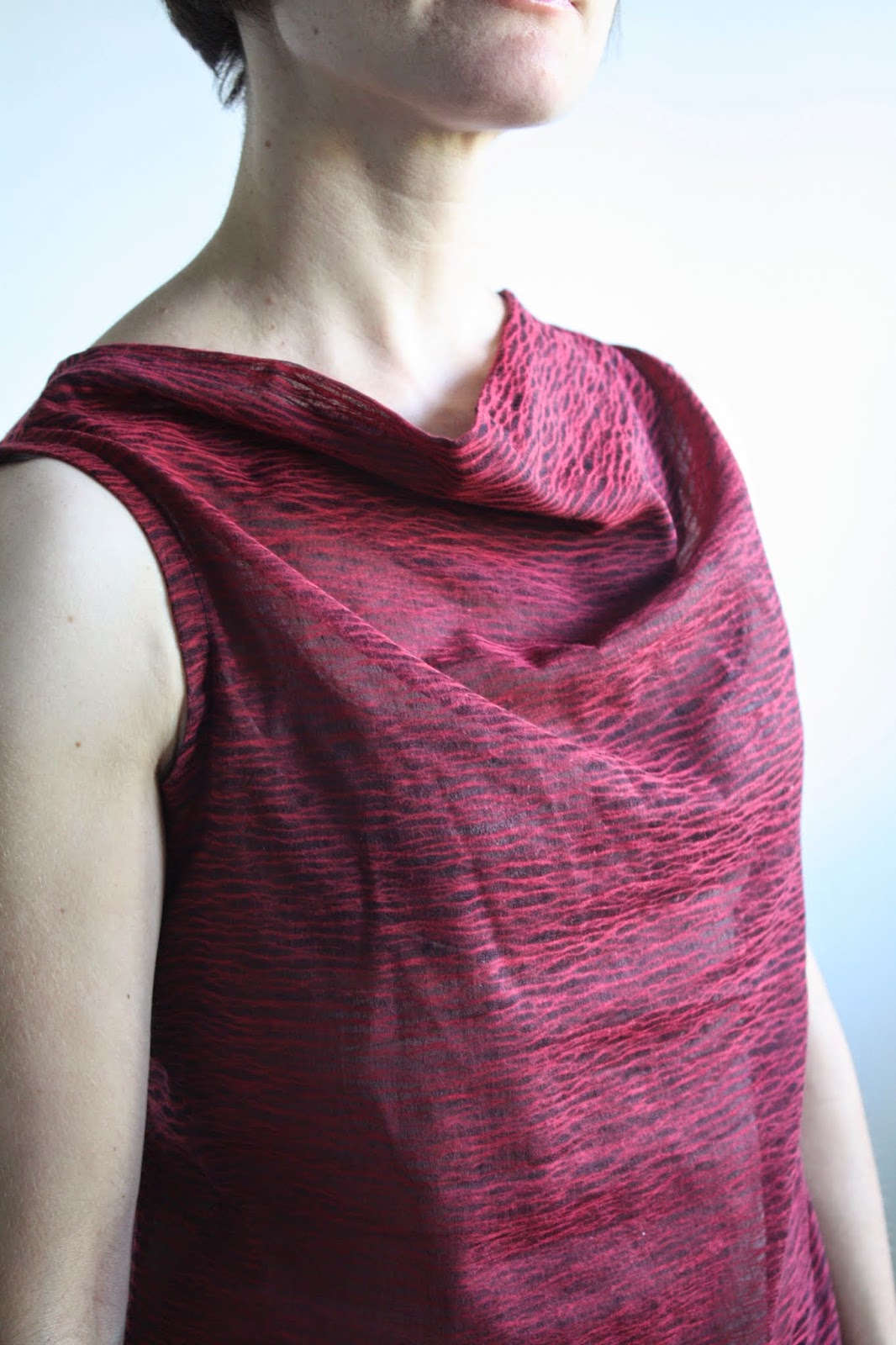 This fabric isn’t an obvious choice for a cowl shape; while lightweight, it isn’t particularly drapey, behaving more like a voile. Nor could I cut on the bias (common for cowls) because of the obvious horizontal stripe. However, I kind of love how the neckline is more “origami folds” than draped.