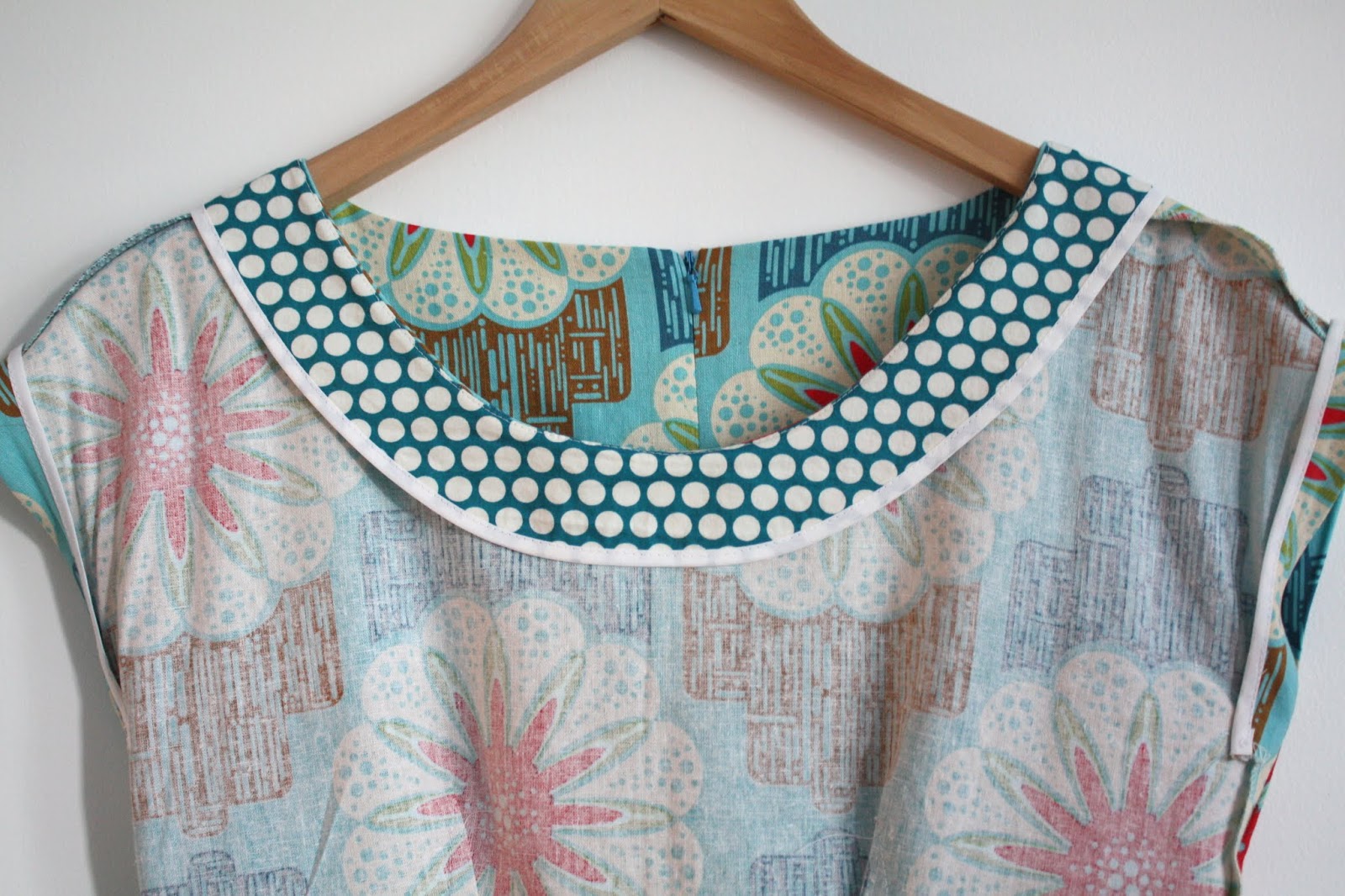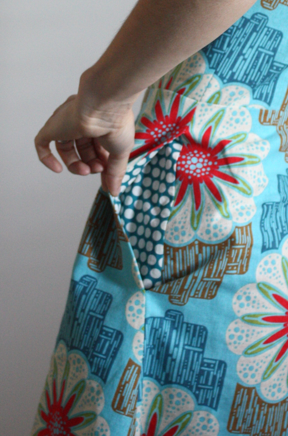 For the construction, I used a serger to finish most edges and cut the facing with the dotted cotton with bias binding. You can see on one of the pockets that I cut into the selvage–why not use those extra fractions of an inch? 🙂 I also bias-bound the cap sleeves on the inside. It makes for such a clean finish.