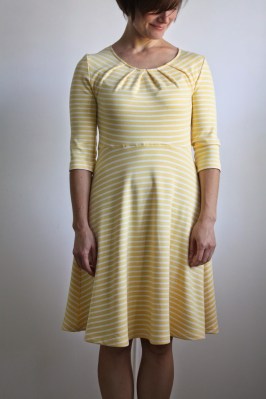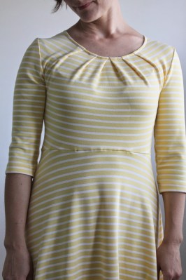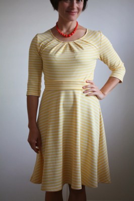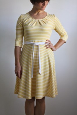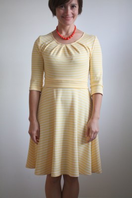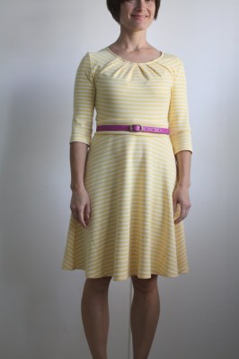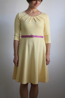 Hey, this dress turned out really cute. I think the soft yellow and white stripe really suits the pattern. And, although I like the pink belt, I actually really like the dress plain. I think that your attention is being drawn to the waistband because you 'know' that it's not quite perfect, but the rest of the world is unlikely to see anything other than a darling dress. And I totally agree with Fabric Tragic…give this dress a go into fall. With maybe a lightweight jean jacket, a soft blue and yellow scarf, tights, and Mary Jane flats…..so pretty!