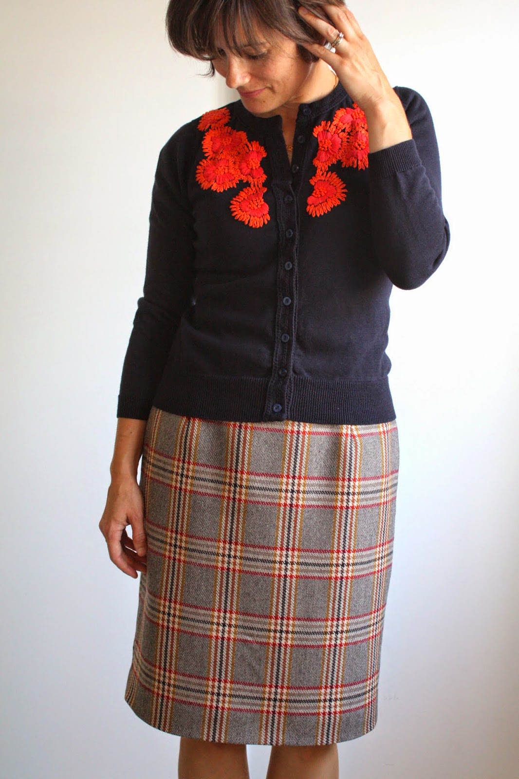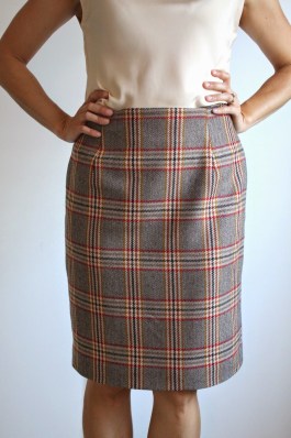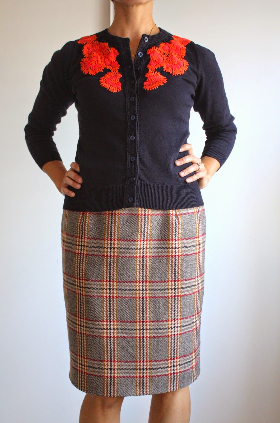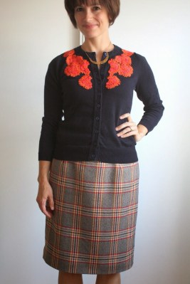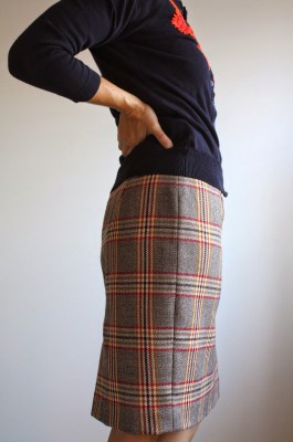 The fabric was purchased specifically to make a skirt to go with this navy sweater with orange embroidery. I had it in my mind that this sweater needed a PLAID skirt, and this vintage wool from Scotland fit the bill. It’s the type of weave that frays a lot, but the hand is very smooth and was a good match for this skirt style.