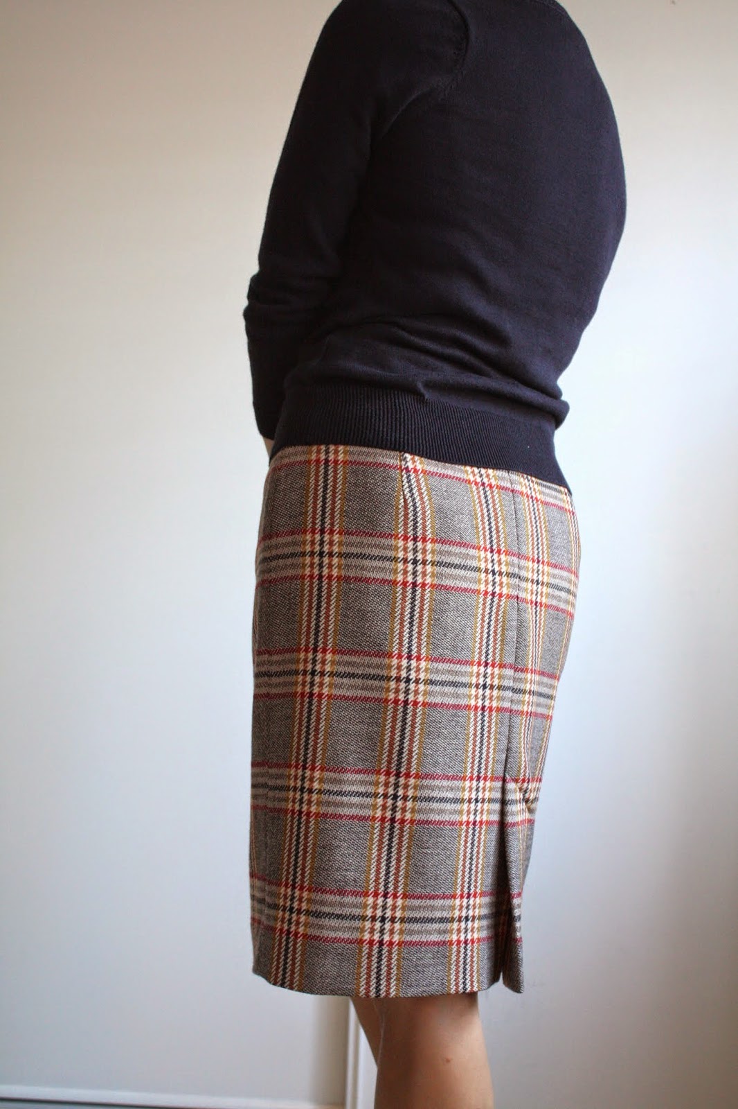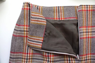 So my pencil skirt project for Pattern making II is jumping the line because it’s done and due tomorrow (and thus won’t be back in my hands until next week). I sewed it today, taking a little more time than normal since the inside finish of the lining is very professionally assembled (I had to have my class notes out to remember the order of operations, and I usually don’t need directions!) and there was some plaid pattern matching to manage.