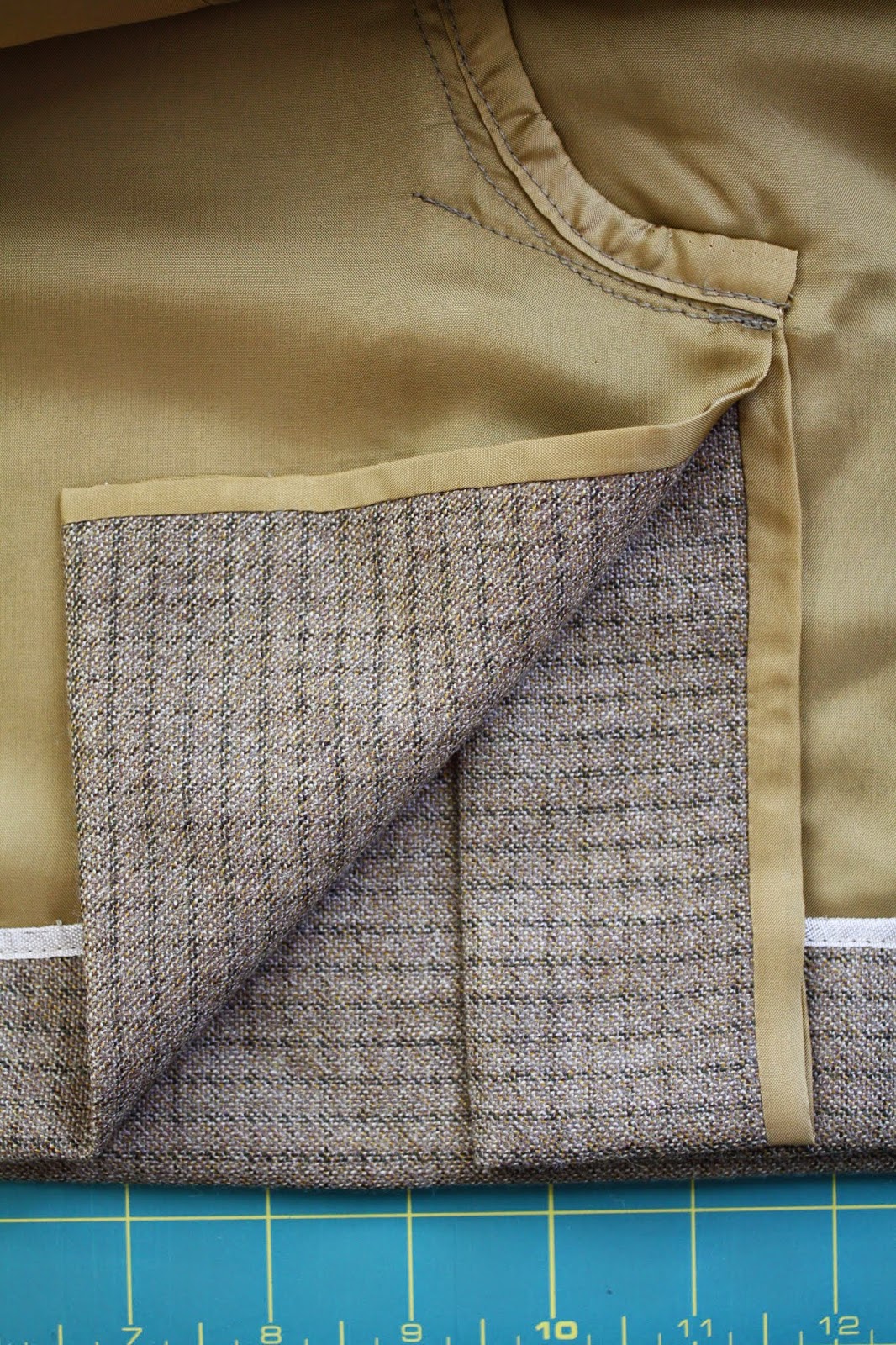 There will be more details shortly about the Hong Kong finish/ underlining method, but cutting the underlining fabric with this new kick pleat is a little special: add the 5/8″ allowance around the vertical seams but NOT the curve connecting the back seam and the kick pleat extension. Looks like this: