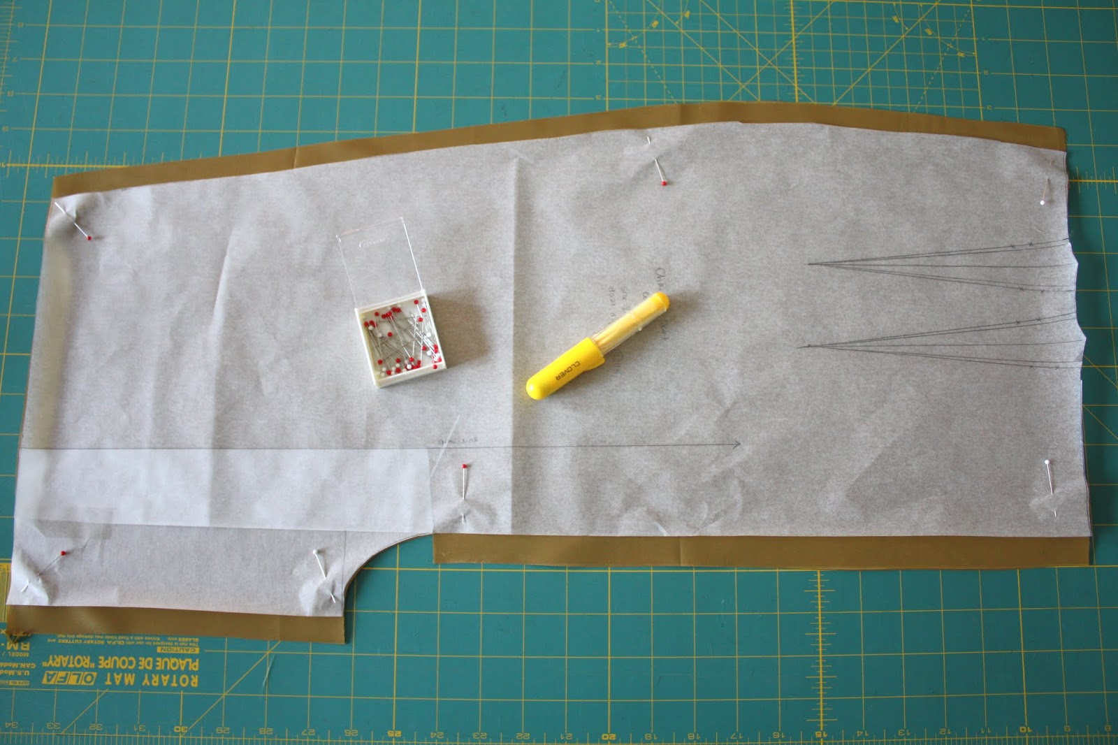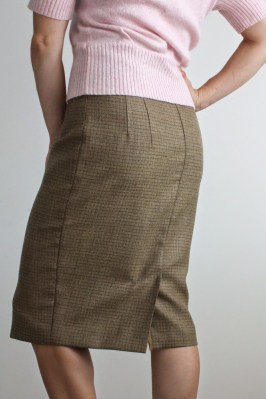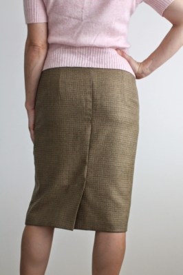 The Charlotte from By Hand London is a lovely high waisted, slim fitting pencil skirt, with a below-knee length. It’s a great shape for work, but with all the walking and stairs I have to do around campus, it’s a tad narrow around the legs. In this tutorial, I’ll show you how to draft a simple kick pleat, which would work for any skirt or dress with a back seam and I’ve written the instructions to coordinate with a special underlining method which will be posted tomorrow.