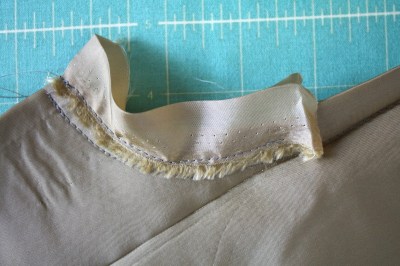 Bind the raw, curved edge with bias tape or a bit of the lining fabric. I used the lining selvage edge for the inside, then turned and edge stitched on the right side.