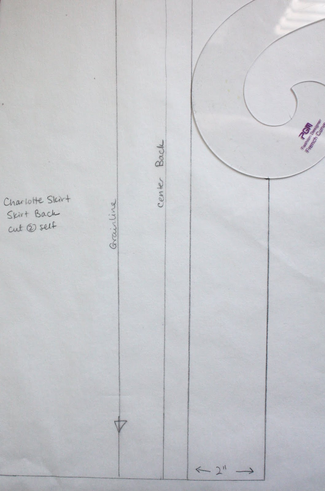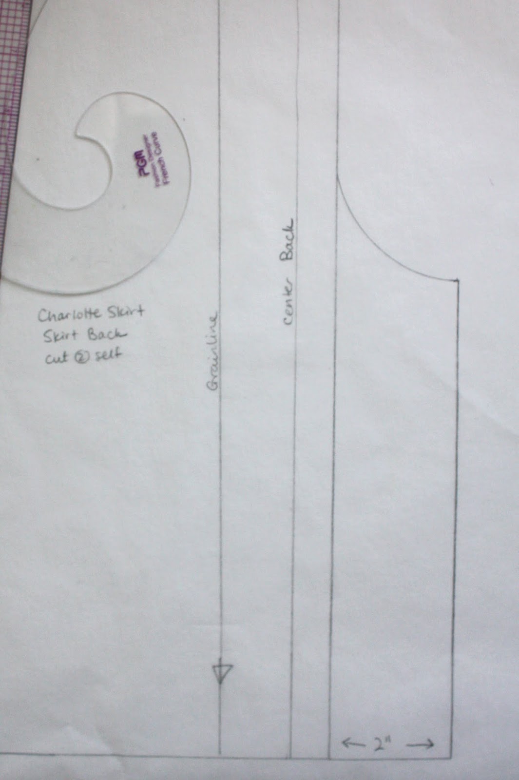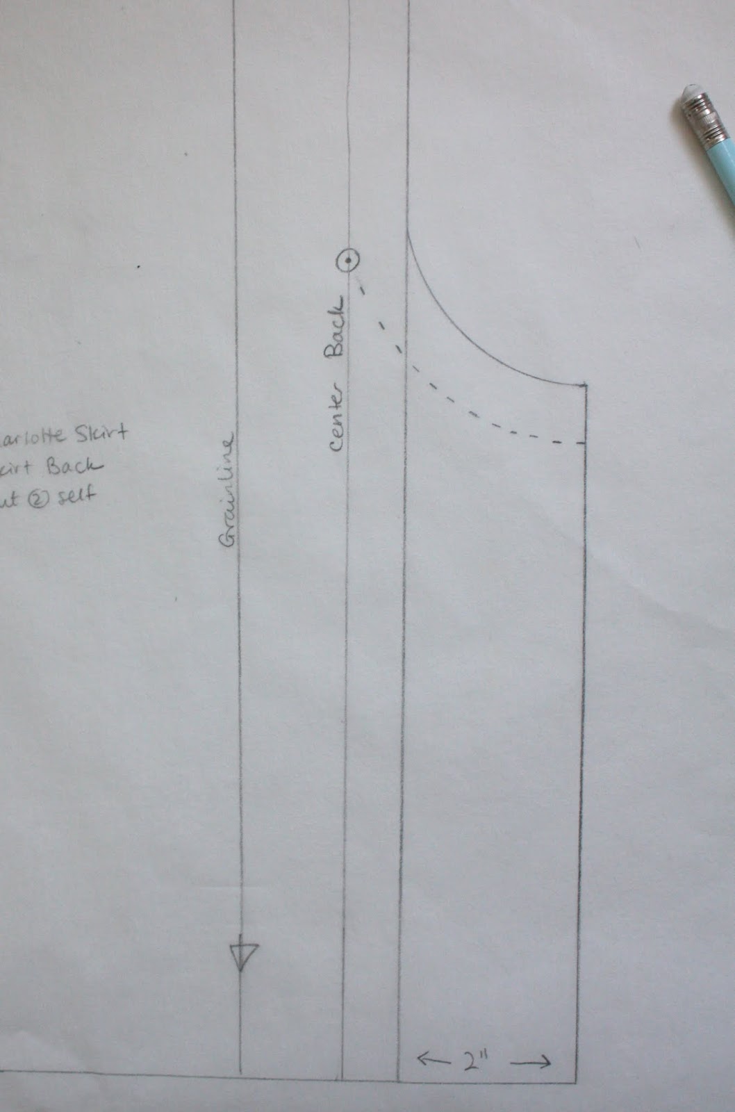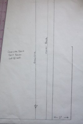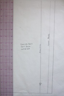 Start off by tracing the Back Skirt pattern piece, but don’t cut it out. I’ve shown just the lower right corner of the Skirt Back, above, with the grainline, center back and cutting line indicated.