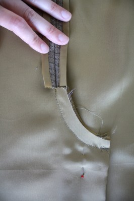For the hem, I used rayon seam binding to finish the edge and then used a blind stitch (only catching the underlining) to hem.