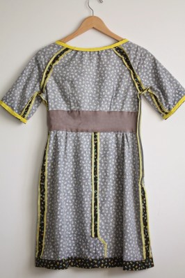 My biggest gripe, though, is with the neckline.  When I first tried on the dress, it all fit nicely (with my standard pattern changes, of course: petite adjustment and small bust adjustment), except the neckline.  It was bafflingly wide!  I ended up gathering the back neckline a bit, adding darts to the top of the raglan sleeve, and adding elastic to the front neckline to pull it in even more.  Much better, but I’m not sure how it was supposed to have worked without those changes!