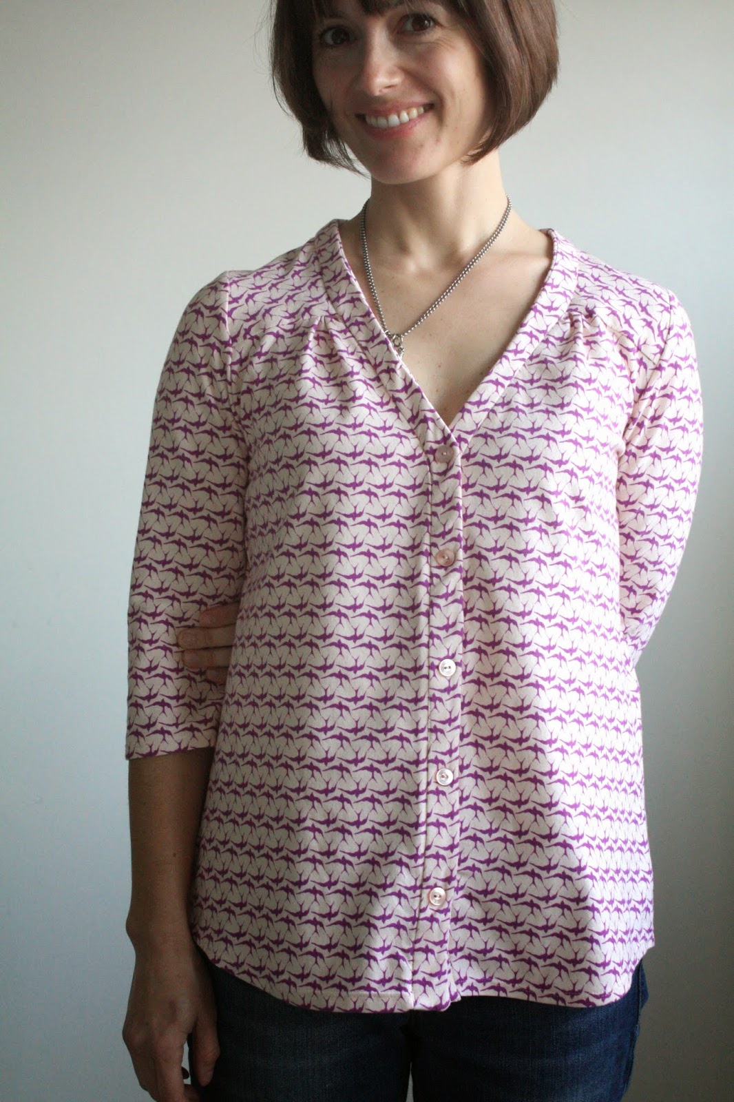 Oh it's pretty! And I hate buttonholes on knit too, they're terrifying. Too easy to wonk out. The shirt does look just maybe a size too big all around? But I love this design and it's totally my style too. So tempting!