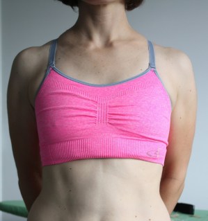 Now, put on your sports bra; you want the band to be stretched before measuring the strap. Tuck the strap under the front of the sports bra band where you would want it, and mark the ends of the strap on the sides of your bra with a pin. There isn’t a lot more scary than pulling a tight bra off with pins sticking out of it, so be careful taking it off!