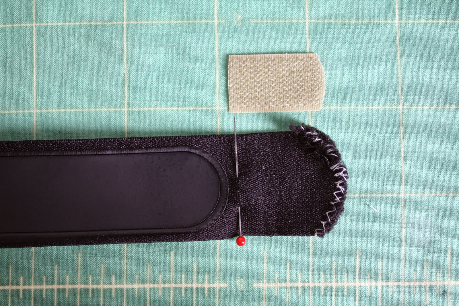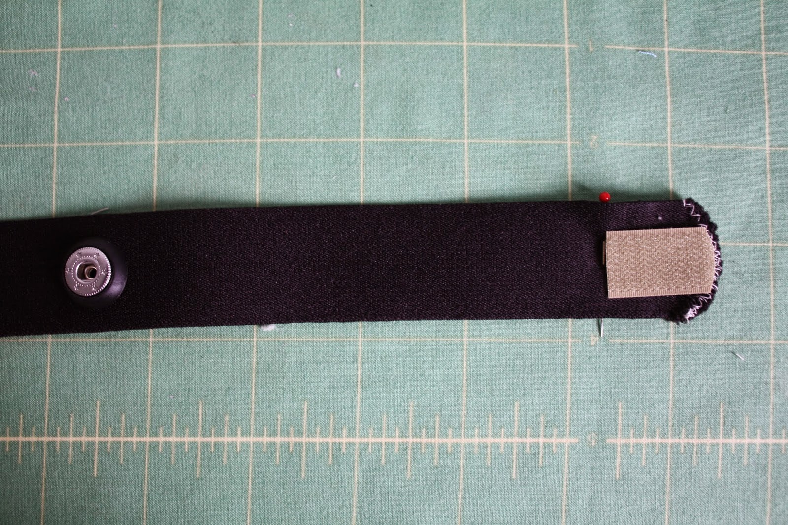 Then, cut strip of loop side of Velcro about 1.5″. It’s good to have it longer than the hook side, to allow for some wiggle room. Center the piece where you’ve pin-dicated (haha!).