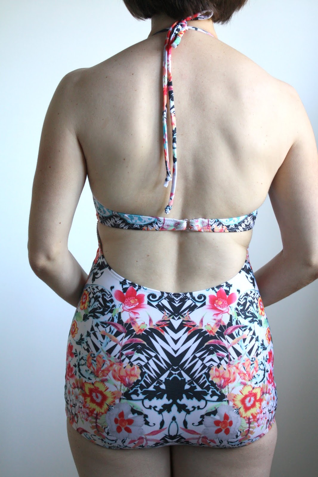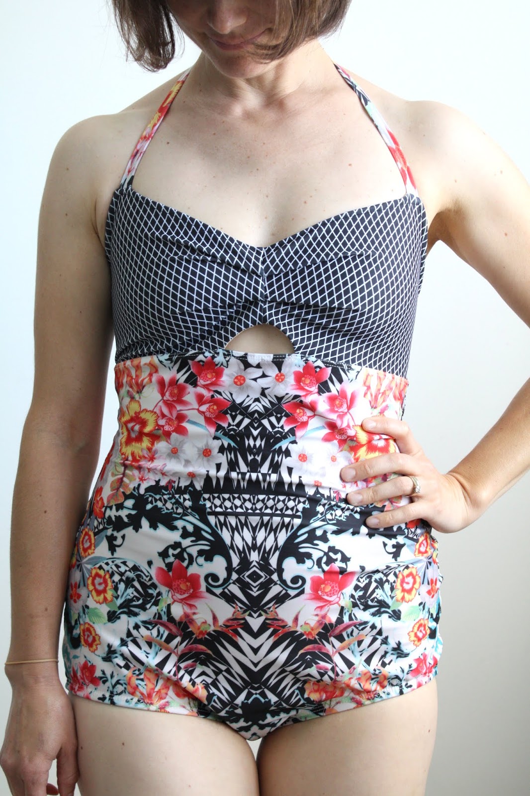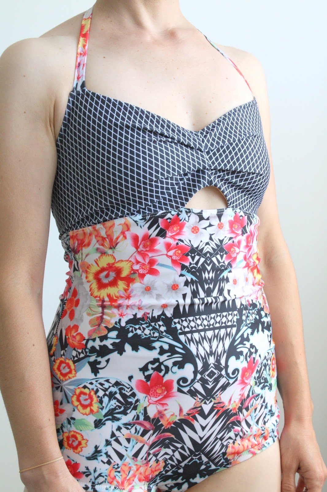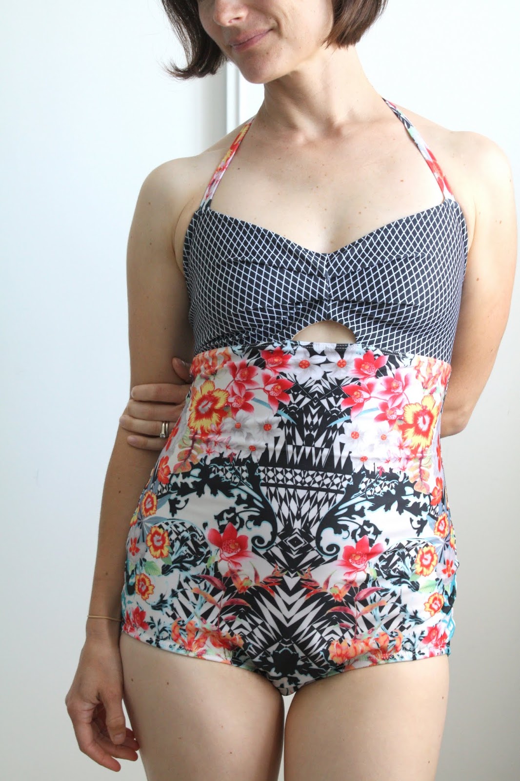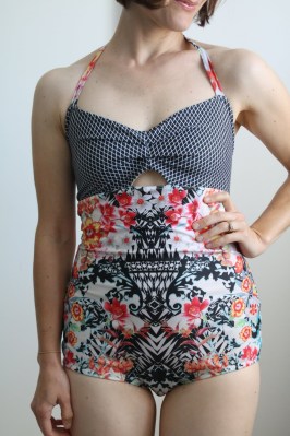 Back to my TnT 1970s swim suit pattern (McCalls 5036, which, if you can get your hands on it, you should buy. The construction is super clean and there are so many options!) Thankfully, I had enough fabric to make a 3rd suit, with addition of a bit of a black and white diamond print for the bodice.
