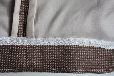 Here’s the inside of one flap of the skirt. For the underlining, I extended the lining fabric (for the Hong Kong finish) only at the side seams; since the rest are covered with a facing or waistband. The non-HK finished sides of the lining/ self edges were just basted together with a 1/4″ SA.