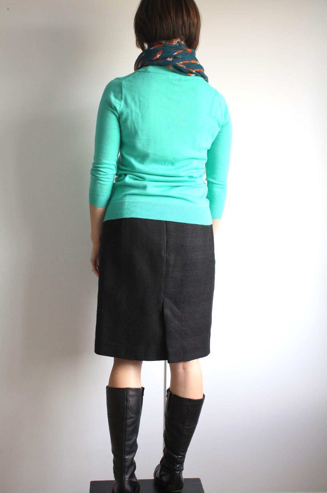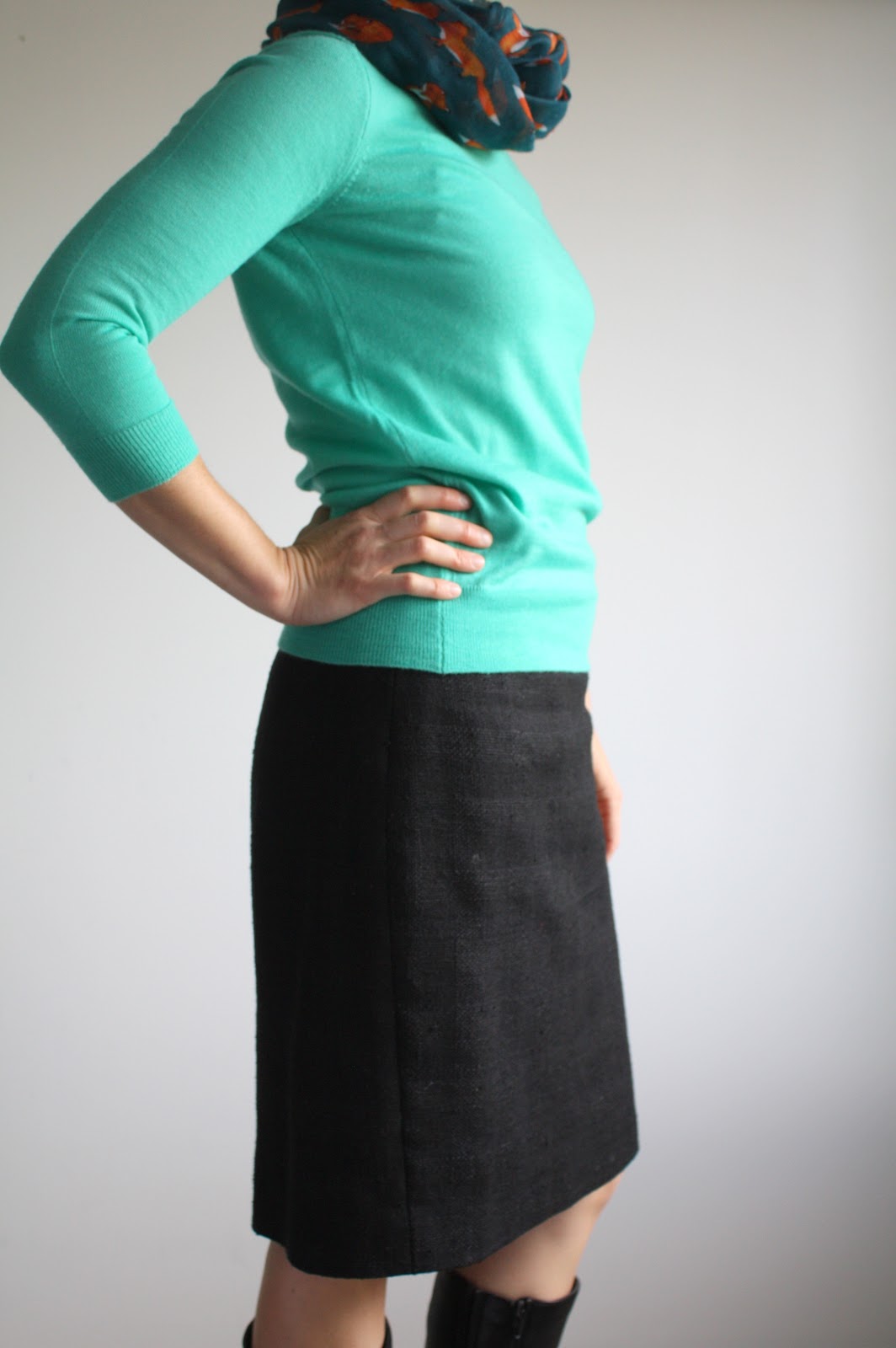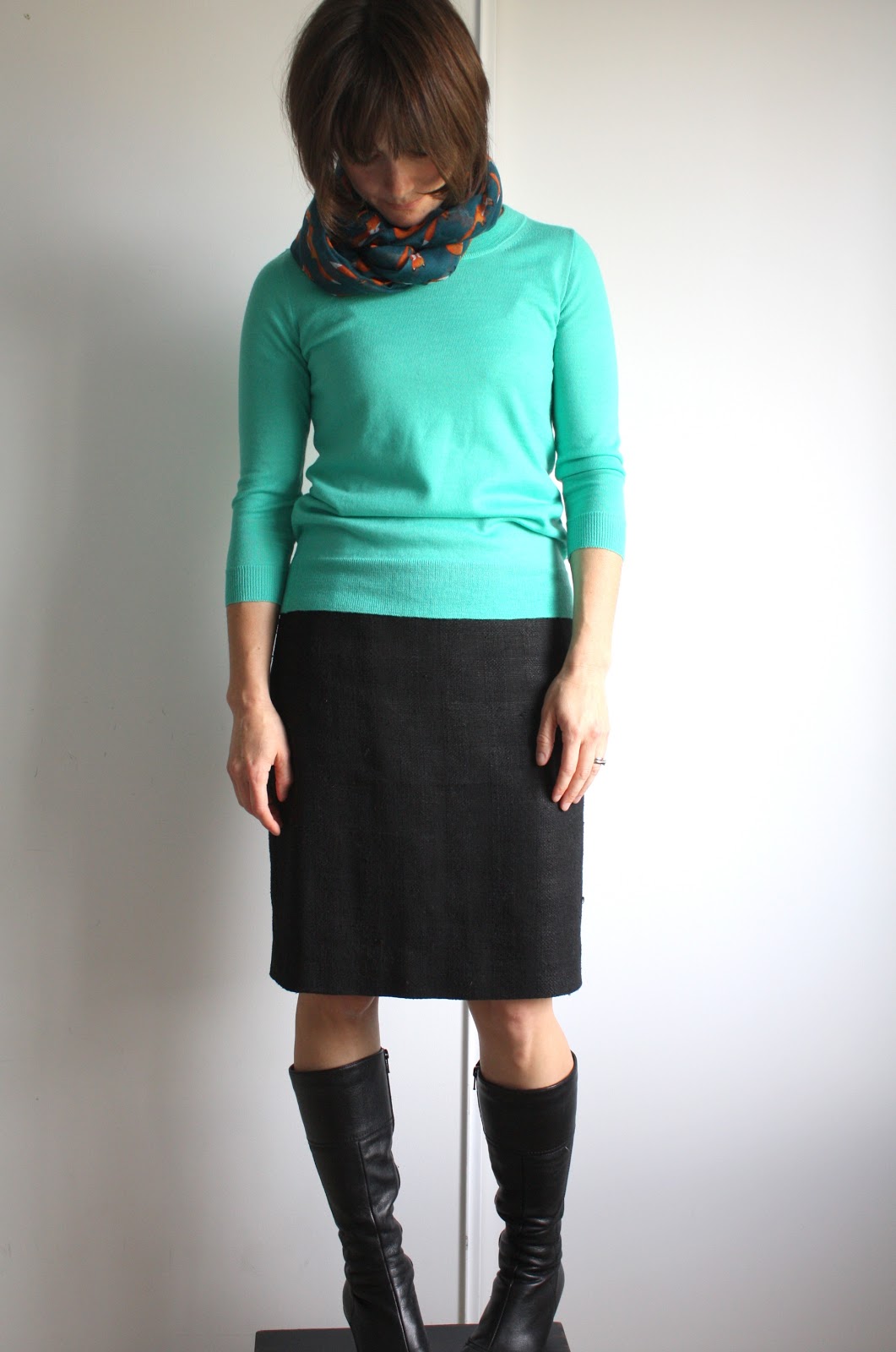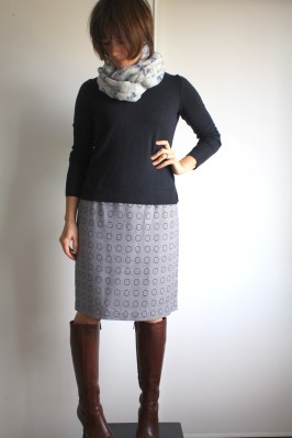 And then there was that day I got a terrible haircut that was so embarrassing that I wore a scarf everyday for 3 weeks, and my uniform was born: straight skirt (from self-drafted, tried and true pattern), fine-gauge sweater, boots, and a scarf. I almost feel like I should apologize to my students for looking the same every day, but I’m not really sorry.