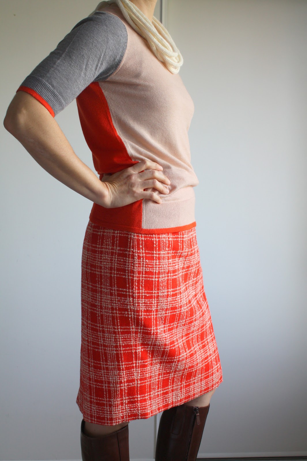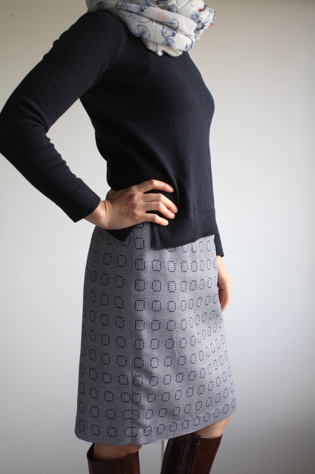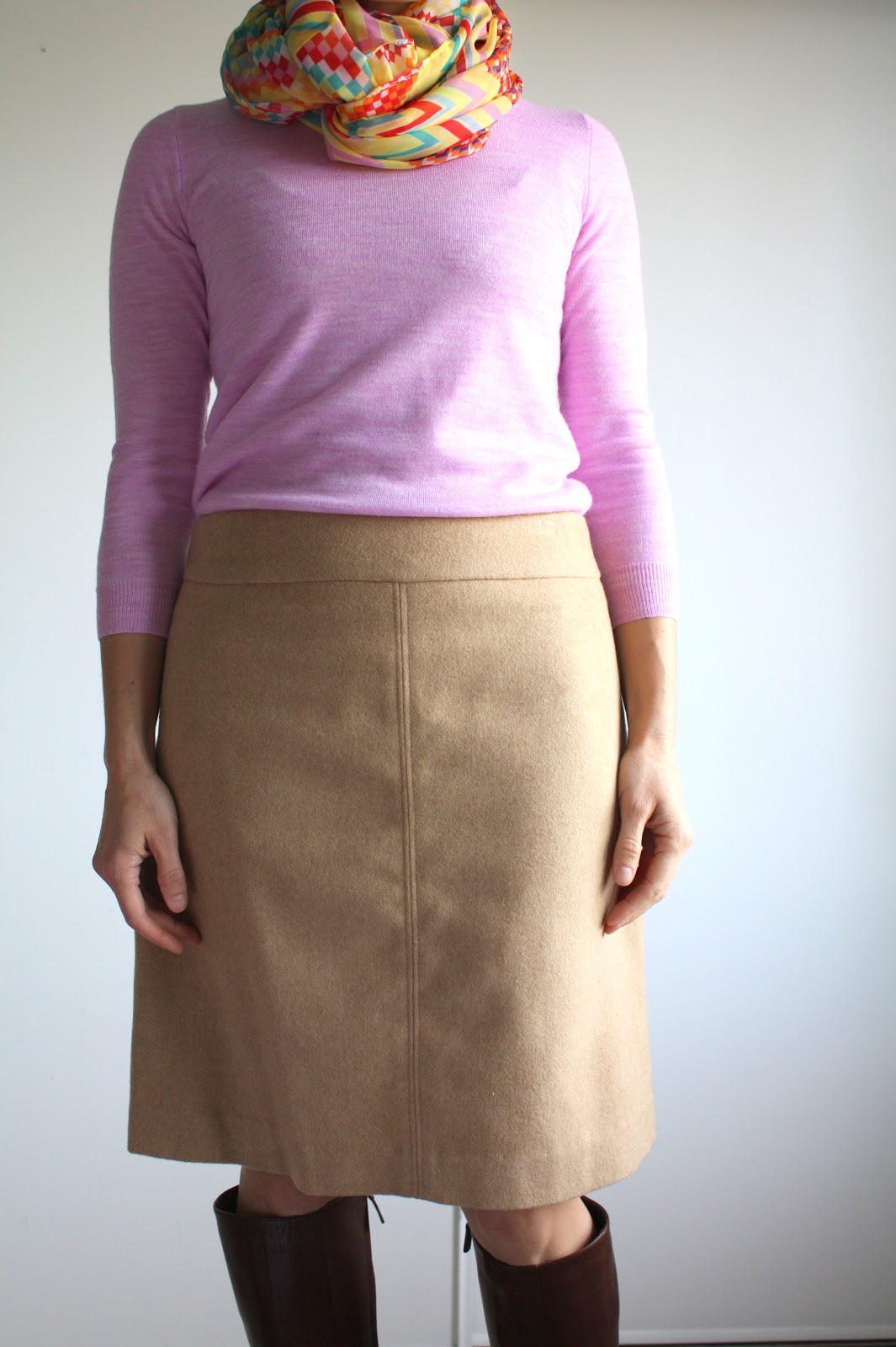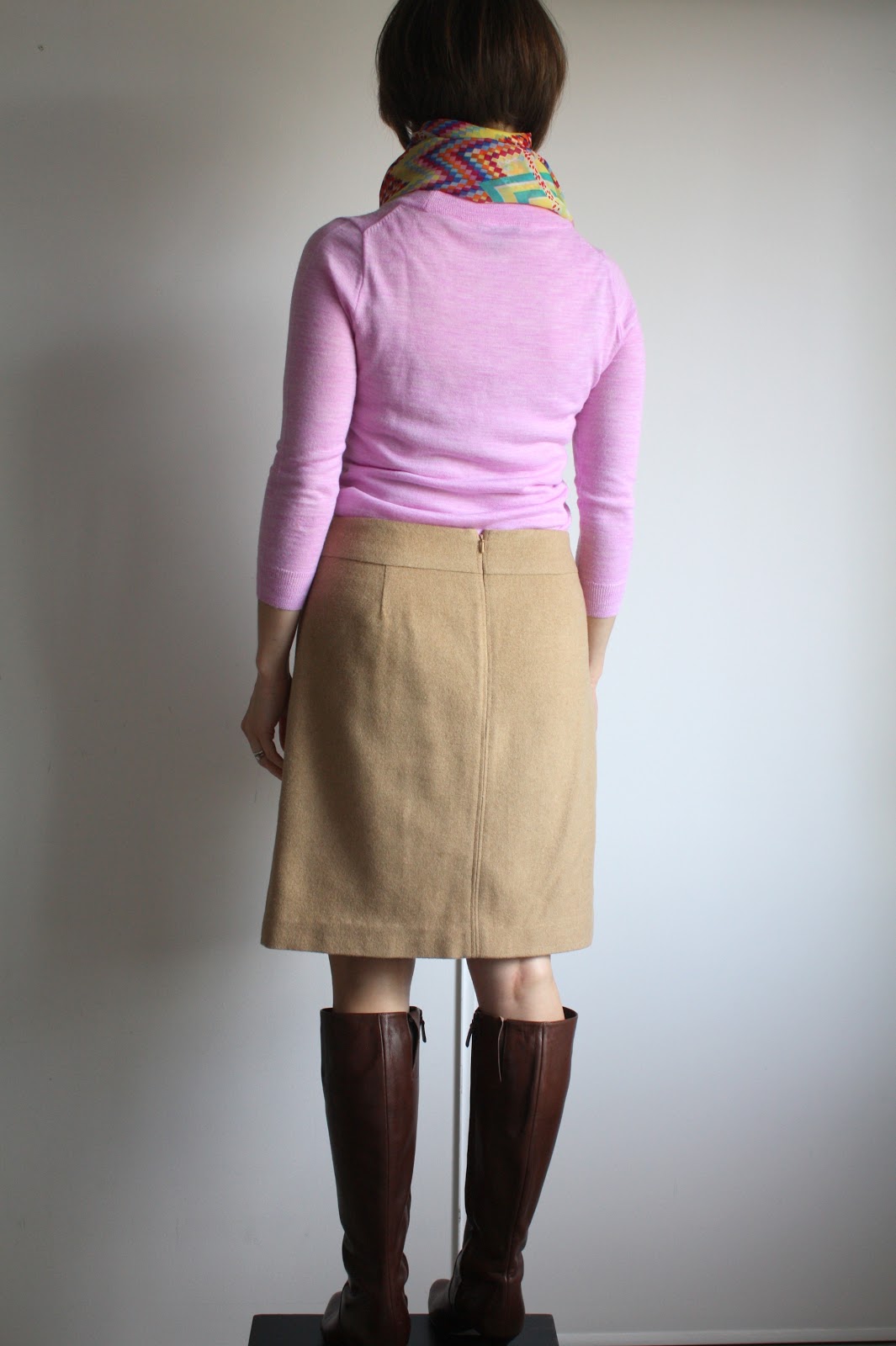 And then there was that day I got a terrible haircut that was so embarrassing that I wore a scarf everyday for 3 weeks, and my uniform was born: straight skirt (from self-drafted, tried and true pattern), fine-gauge sweater, boots, and a scarf. I almost feel like I should apologize to my students for looking the same every day, but I’m not really sorry.