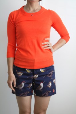 Maybe there is a bit of the same embarrassment in these shorts as the name suggests to my heart. I was super excited about this fabric (stretch cotton twill, from Mood), and this project got bumped to the top of the list because I was so in love with the idea of shorts with birds on them. Now that I’m wearing them, I feel a little bit like I’m wearing the inside of a sleeping bag from the 70s. Remember those woodland duck prints? (Go ahead and Google “vintage coleman duck sleeping bag“). Hmm….