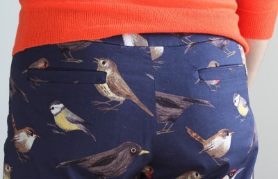The only significant change I made this time around was to sew in some functional back welt pockets (using my tutorial, here). The fabric seemed more refined, and therefore suited a more formal pocket in the back (yes, I’m still referring to fabric with birds on it–the substrate was refined, not the print!). All attempts to pattern-match the welts were utter failures, so I ended up just trying to avoid birds entirely for the visible welt.