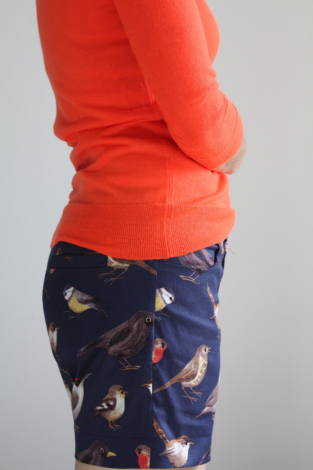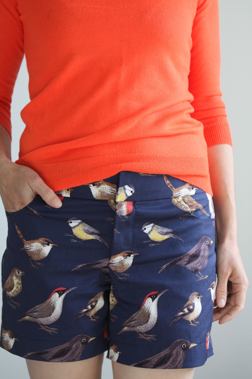 Maybe there is a bit of the same embarrassment in these shorts as the name suggests to my heart. I was super excited about this fabric (stretch cotton twill, from Mood), and this project got bumped to the top of the list because I was so in love with the idea of shorts with birds on them. Now that I’m wearing them, I feel a little bit like I’m wearing the inside of a sleeping bag from the 70s. Remember those woodland duck prints? (Go ahead and Google “vintage coleman duck sleeping bag“). Hmm….