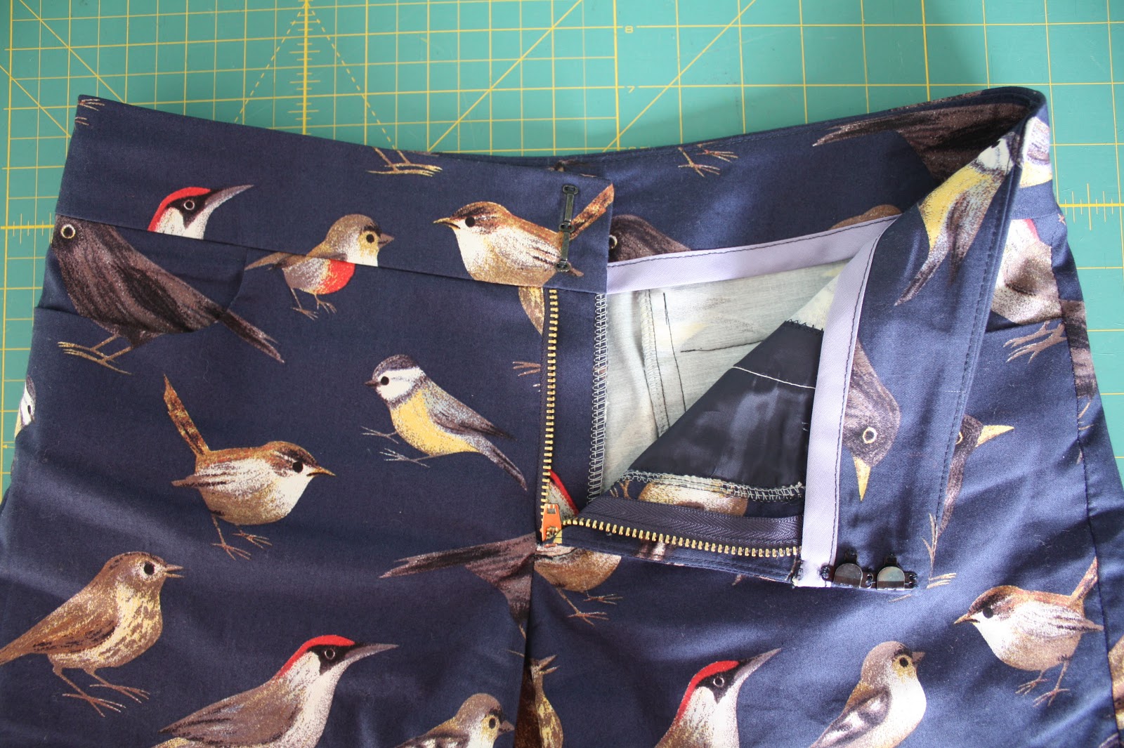The only significant change I made this time around was to sew in some functional back welt pockets (using my tutorial, here). The fabric seemed more refined, and therefore suited a more formal pocket in the back (yes, I’m still referring to fabric with birds on it–the substrate was refined, not the print!). All attempts to pattern-match the welts were utter failures, so I ended up just trying to avoid birds entirely for the visible welt.