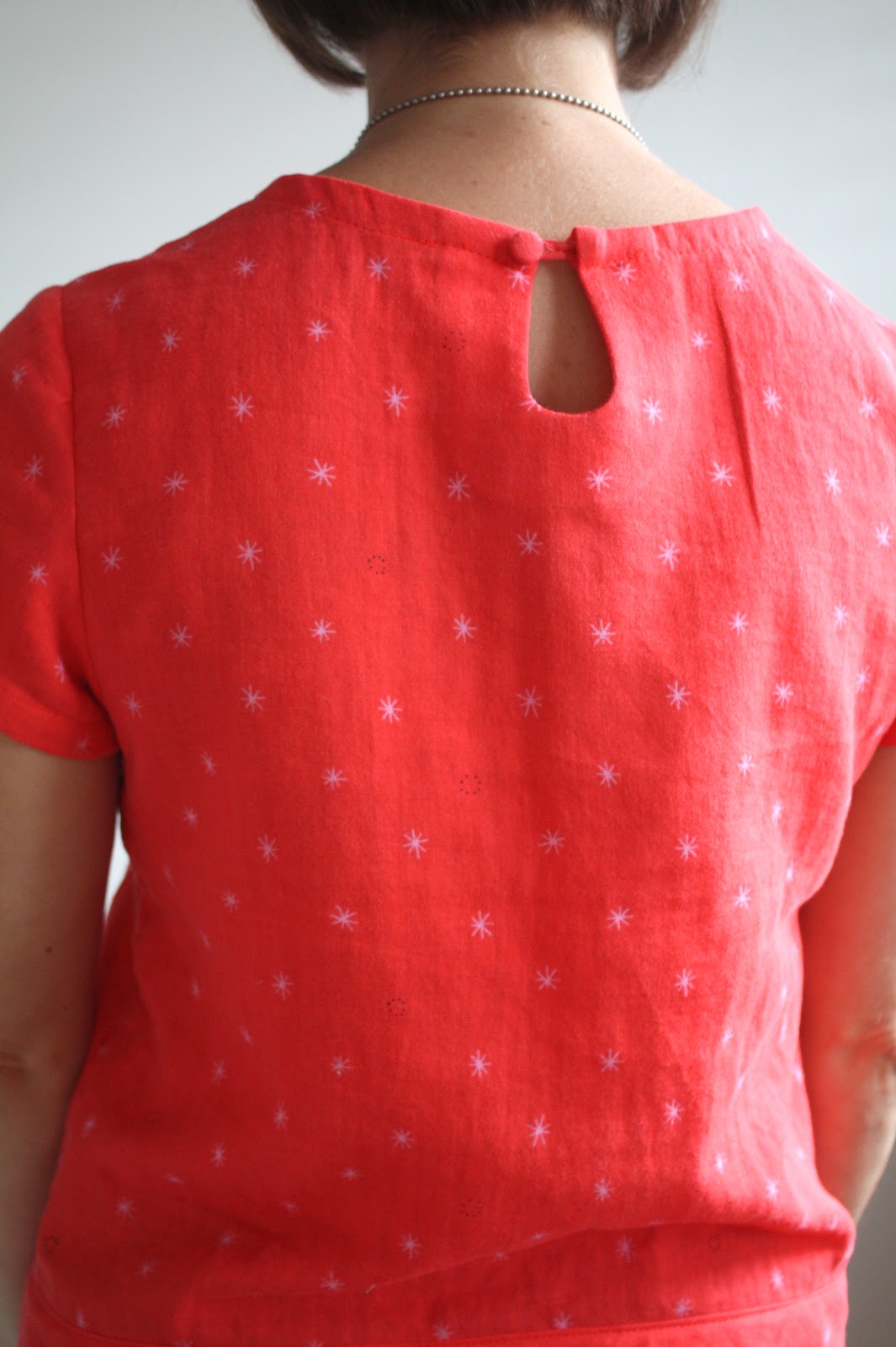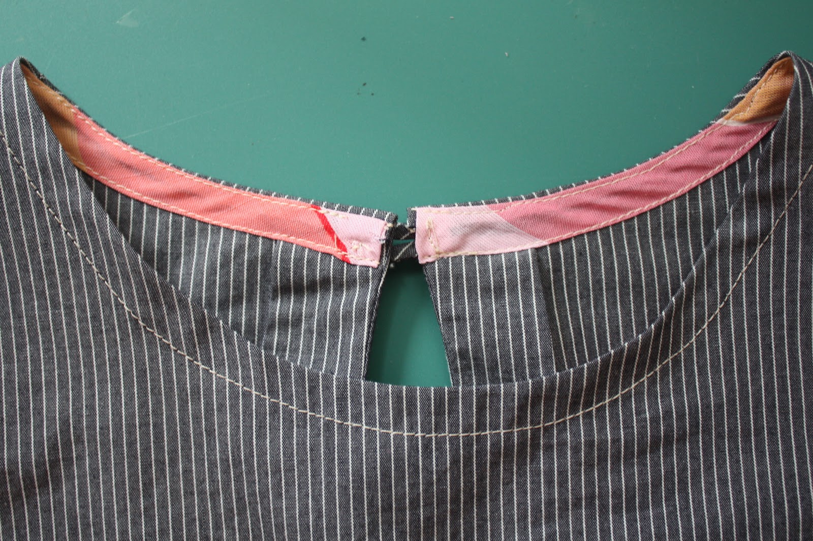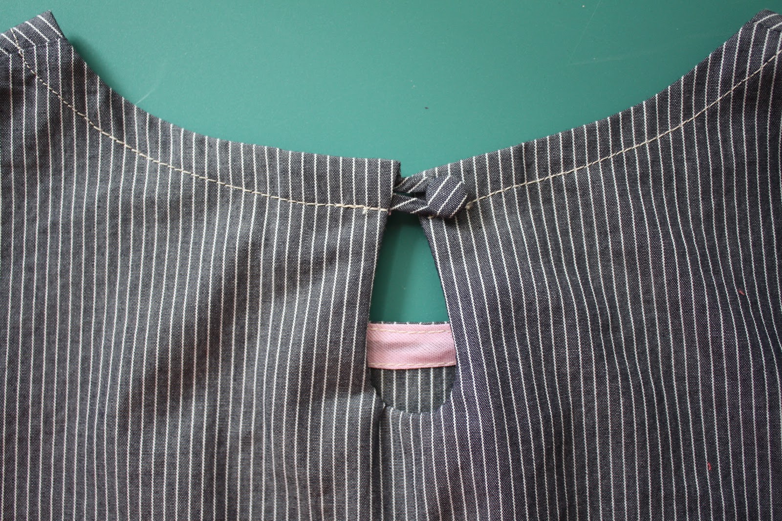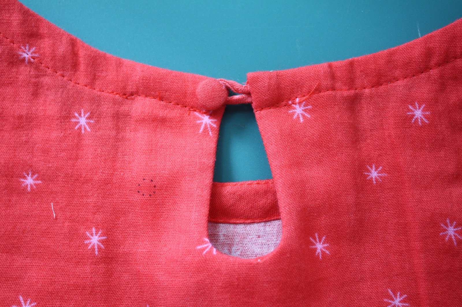 I used self fabric for the button, loop and bias tape for the neckline. Man, I {heart} covered buttons.
