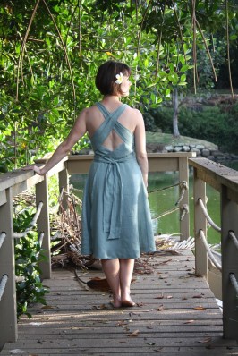 Siren Sundress by Decades of Style. The dress has a faux-wrap front bodice, with secured wrap skirt in the back. However, the highlight of the design is the cross-wrapping straps that wrap around the waist to tie in the back. Lots of wrapping going on in this dress! While it takes a while to get it on (with the aid of a mirror or significant other to keep the straps flat), once “assembled”, it is comfortable and secure.