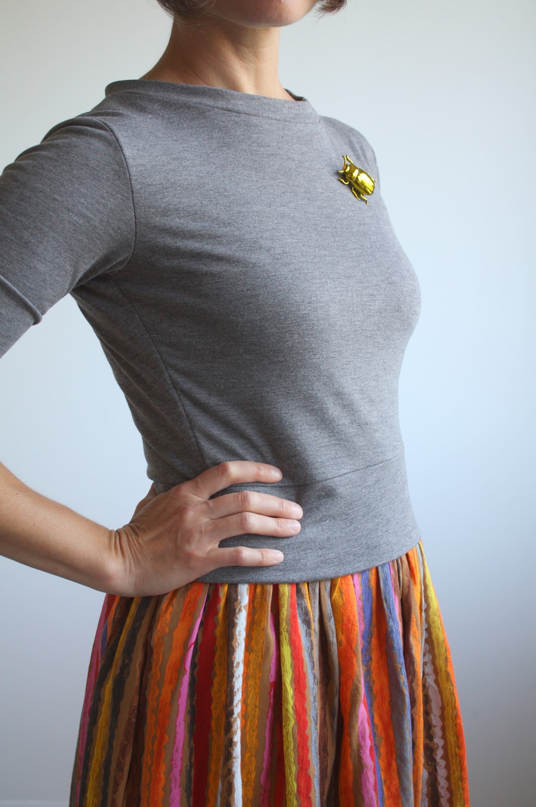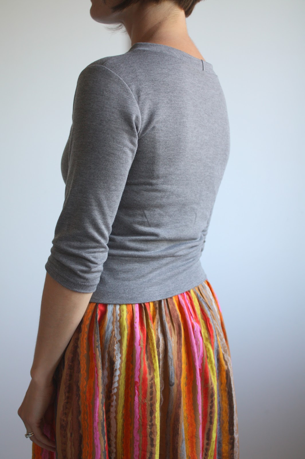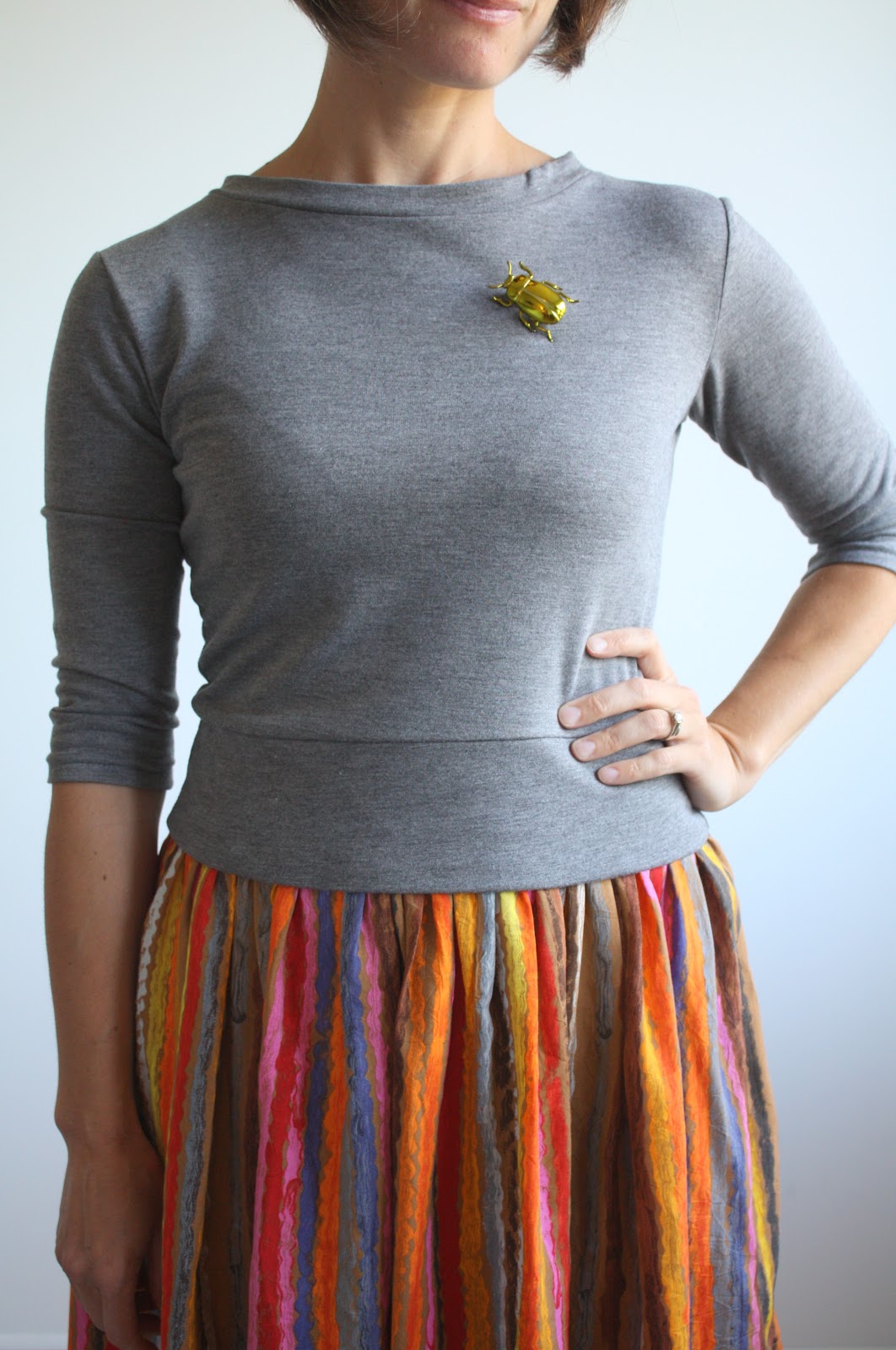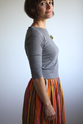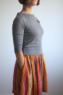 Of course there was only one top option in my wardrobe to wear with this circus-tent print of a skirt, and I didn’t love it, so I bought the Astoria sweater pattern (Seamworks). The slightly cropped, slightly vintage, and really simple design were a prefect match for the skirt. Love the wide waistband and 3/4 sleeves!