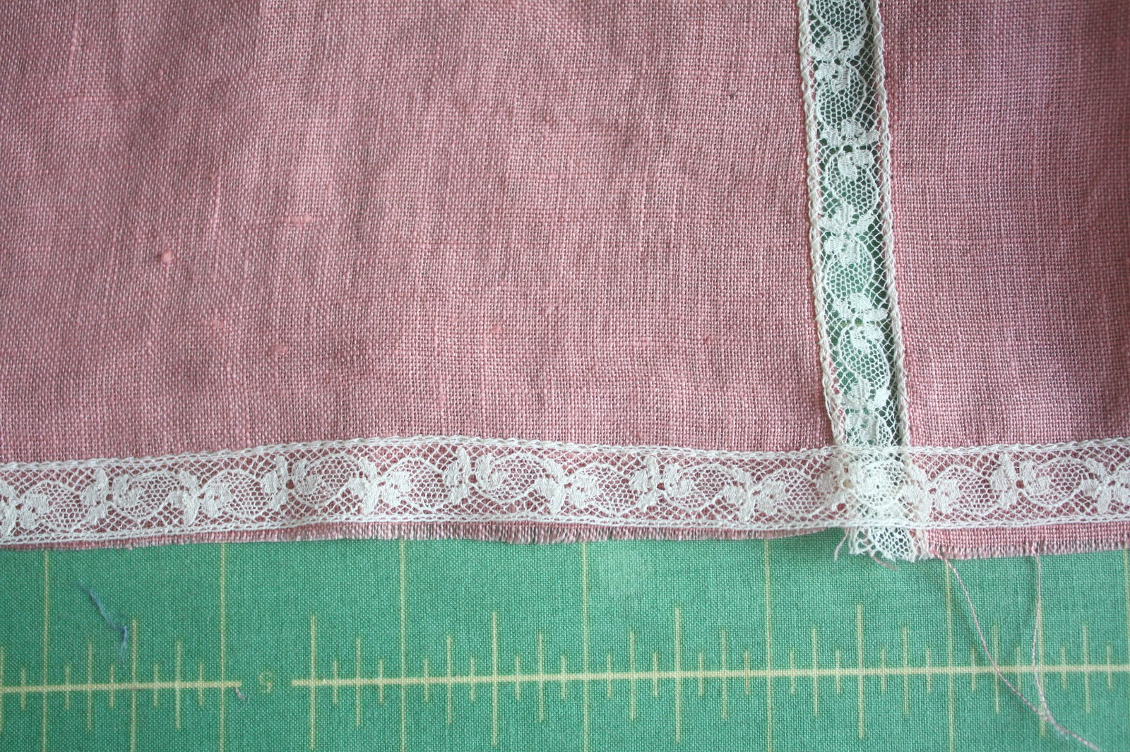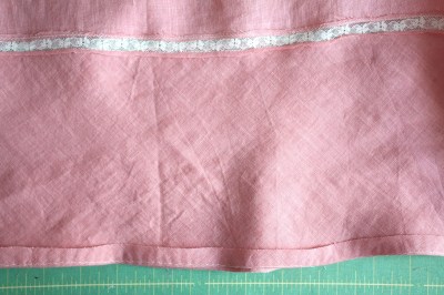 Perhaps the best way to do it would have been to mimic what I did with the curved seams; sew the first seam as instructed with basting stitches, apply the lace, remove the basting stitches, and then fold up the hem band to attach to the lace edge.