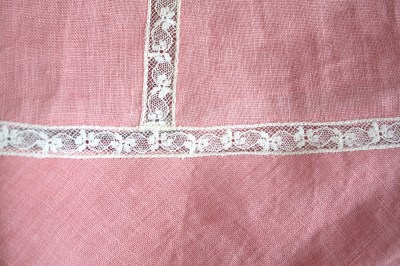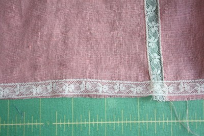 The fabric was pressed open, zig-zag stitched and pressed close to the seam. (Sorry, no photos!) To attach the bias band, I positioned the fabric right side up, underneath the lace, attempting to have an equal seam allowance all around. Below is what it looks like from the right side, and then what it looks like from the wrong side. Back on the right side, I used a straight stitch to attach the lace to the band.
