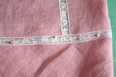 Finally, I folded the hem band in half lengthwise, carefully lining up the edge of the hem band with the edge of the lace, pinning all the way.