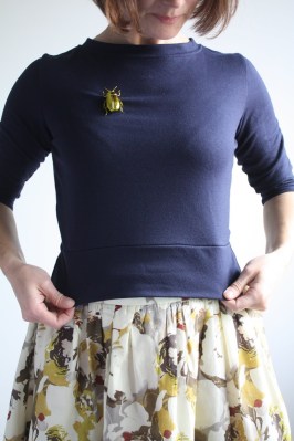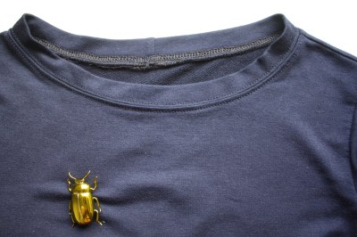 I used my double-needle coverstitch machine to finish the neckline. Yes that’s a beetle. I have a thing for biology-related brooches.
