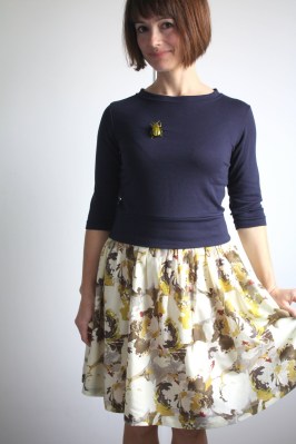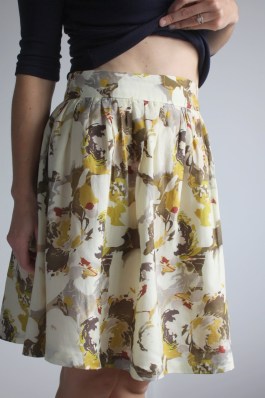 The pattern is the Brumby skirt (Megan Nielsen), cut down in length a bit. The waistband is curved, but it sits like it’s a straight band, which is fine for this overall look, but isn’t very comfortable for me.