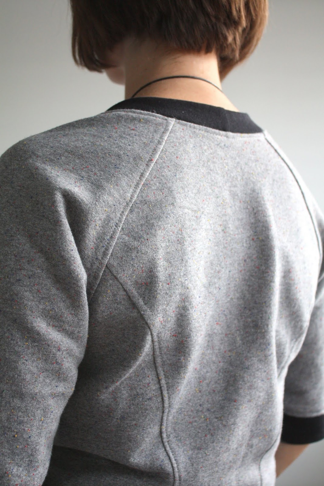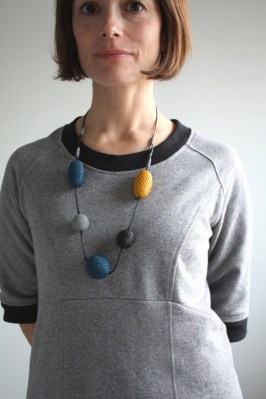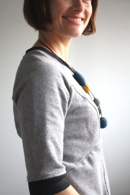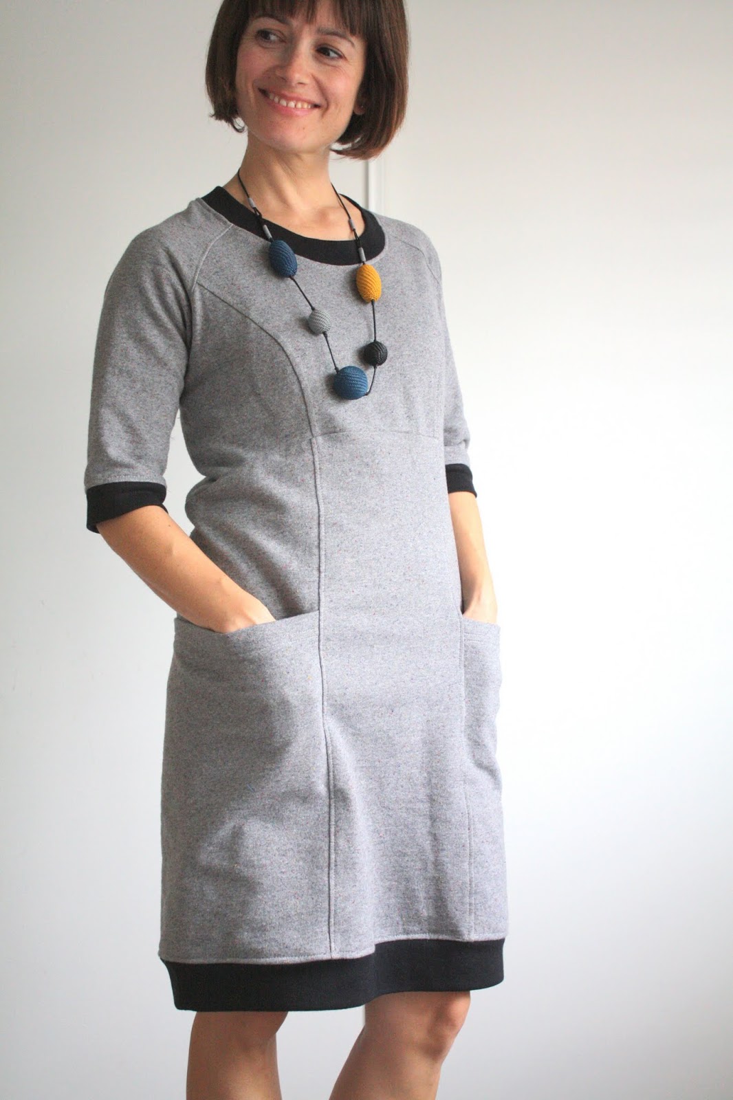 I must admit that pattern was never on my radar…your version makes me reconsider it. I love grey! And that necklace! Your son is a pro…very nice picture and smile. BTW, somehow you remind me of Doris Leuthard, soon to become Swiss president…just a lot younger! I think it's the smile and haircut (it's meant as a compliment!)