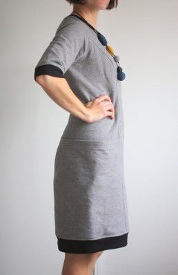 The pattern is the Lola dress, by Victory Patterns. I’ve been looking at this dress pattern for a while, and when I ended up with a couple of lengths of sweatshirt-type material, I realized it would be perfect. The pattern has some amazing style lines and giant pockets (I can fit a box of spaghetti in there, as I discovered at dinner tonight!).