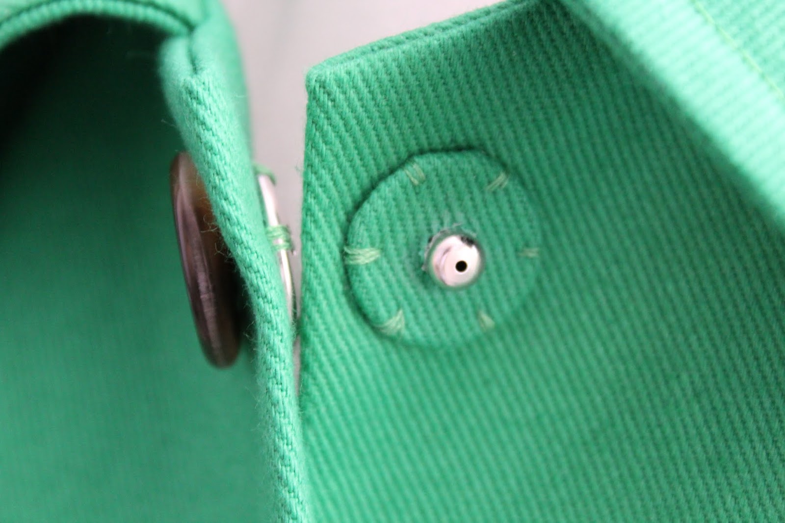 The original instructions call for a faux button over snaps. I hadn’t planned ahead for bound buttonholes, and I don’t have the skills or gimp to hand finish a button hole, so I went along with the written directions. However, I wanted to cover the male side of the snap, to make it slightly less obvious when worn open. If you didn’t see it the other day, I posted a little tutorial for covering snaps when working with thick fabric.