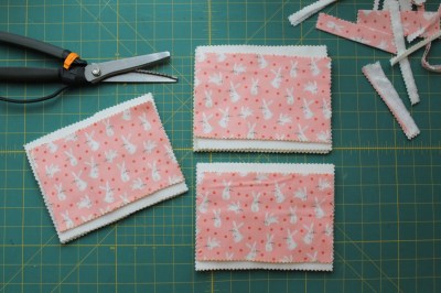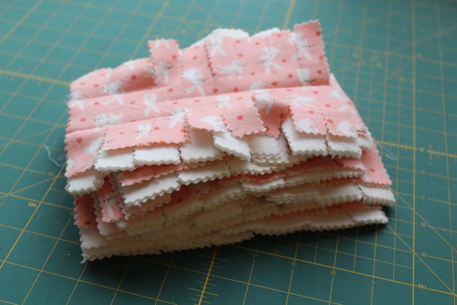 Here are my first 6 dusters, but a full yard of each color (pink and white) should make about 9 dusters total with the dimensions I used (7″ x 5.5″ for the white, 7″ x 4.5″ for the pink). After making this batch, I don’t think the dusters need quite so many layers–perhaps a total of 4-6 layers would do the job just as well, and save some fabric in the process.