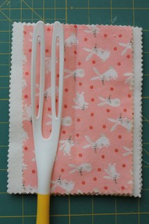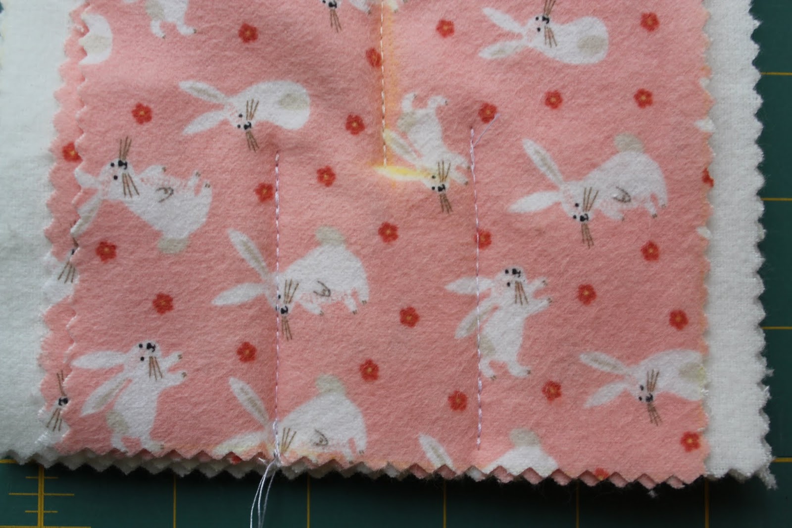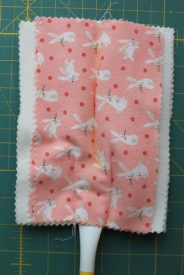 After browsing the limited flannel section at my local quilt shop, I fell in love with this pink bunny print. Dust bunnies….get it?? 🙂 To make the duster work even better with the yellow Swiffer duster handle, I started off by sewing the stack of 8 flannel “sheets” down the center about 5″ (where the “fork” begins).