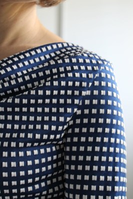 Let’s talk about the fabric, though; it is the true star of this garment (at least that’s my impression based on the number of approving comments I received when I wore it!) I purchased it last month with an allowance from Britex Fabrics and unfortunately, it’s not available anymore. I normally wouldn’t pick a polyester knit, but I just adored the raised square texture! The fabric is on the thick side–not quite a scuba knit, but with a good heft. I don’t think I’ll enjoy the poly knit in the blazing heat of the summer, but it was very comfortable for our early spring temps.