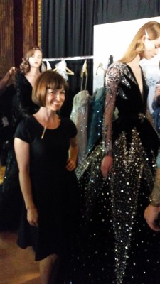 Alexandre Vauthier was our 4th show and I didn’t take any photos of the garments (here is the Swarovski-encrusted garment I put on my model, though.) The picture, above, is inside the Grand Palais with a glimpse of the partial “Eiffel Tower” that Chanel used for their show. In some cases, designers don’t permit photos behind the scenes until after the show, but in this case, I didn’t take photos because it was outrageously hot in the Grand Palais and I was hungry and thirsty and on my feet for 5 hours. I wasn’t happy enough to document the event!