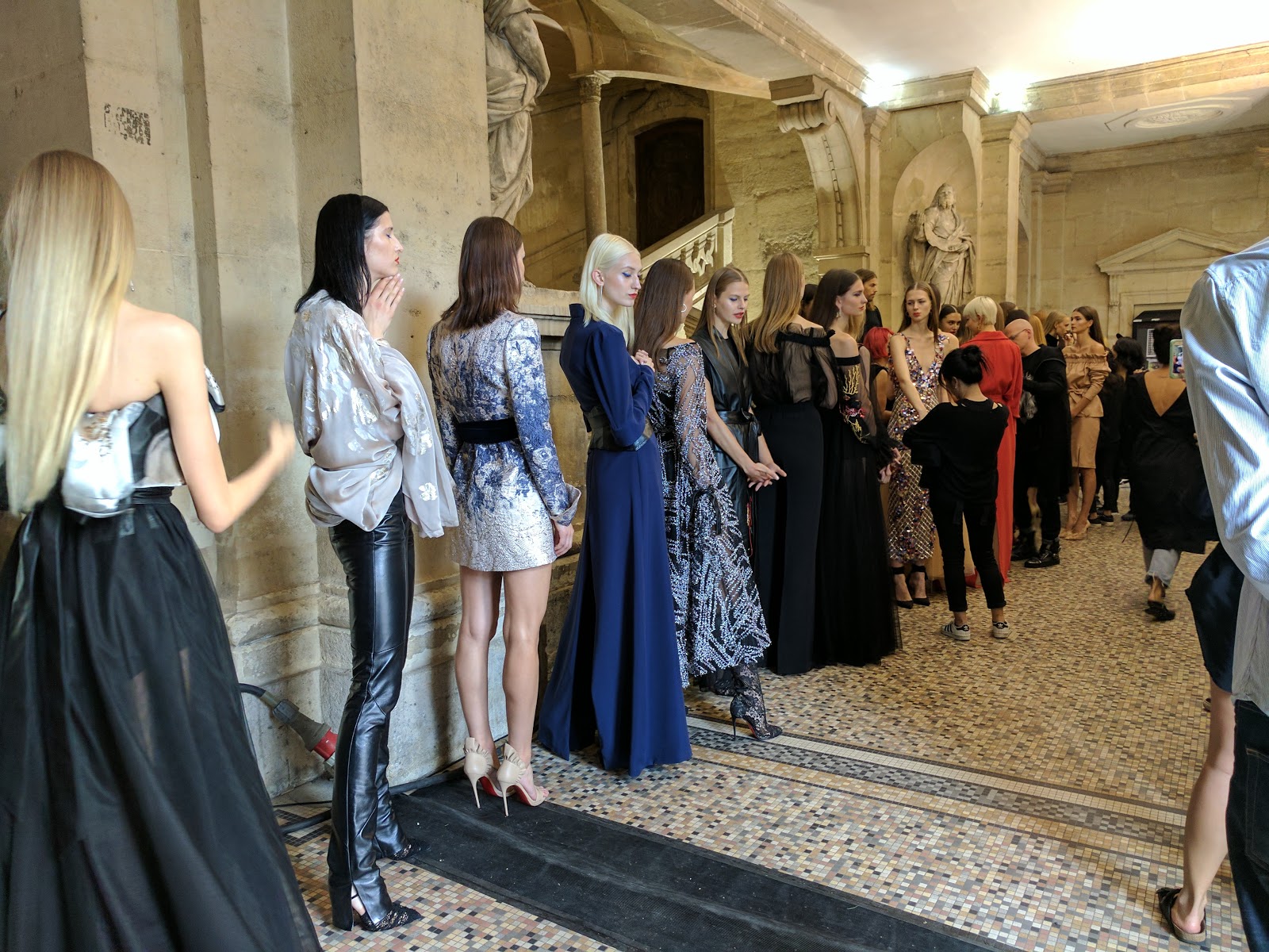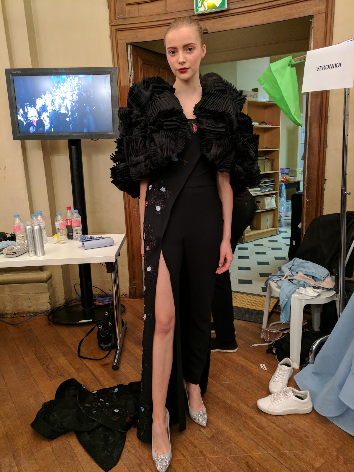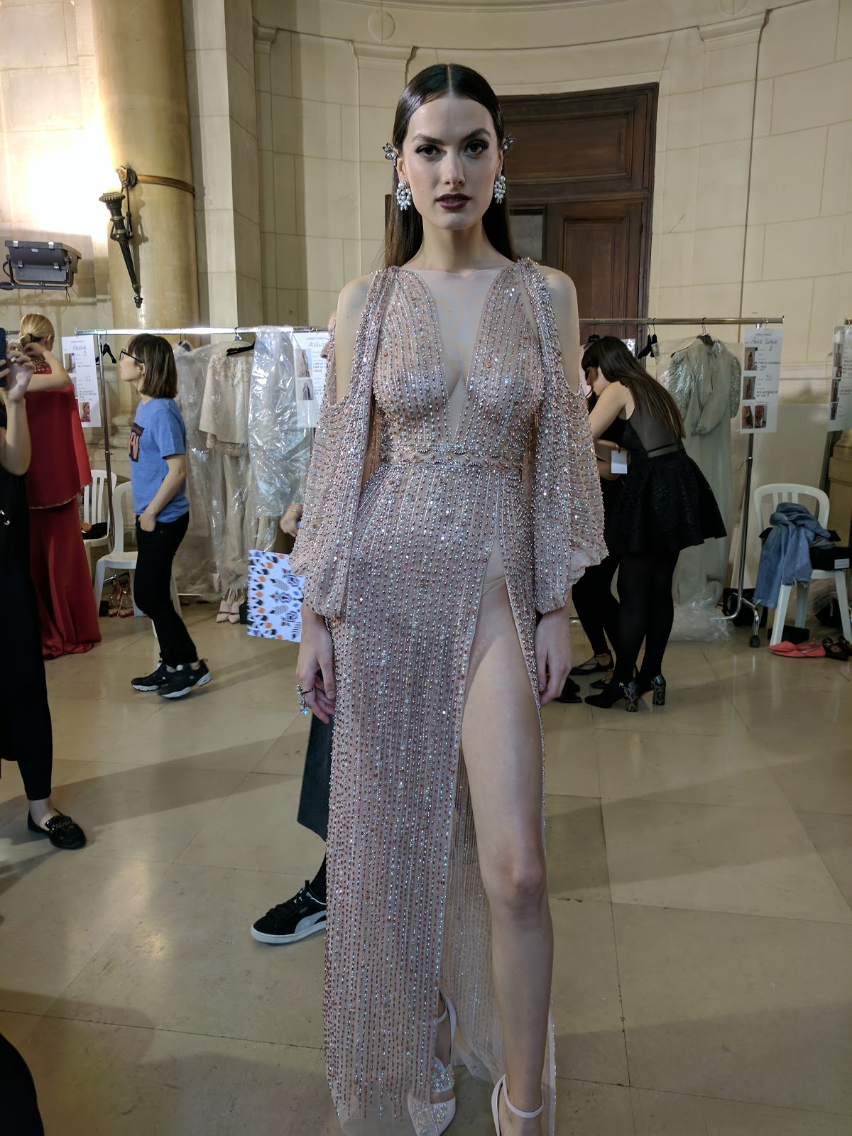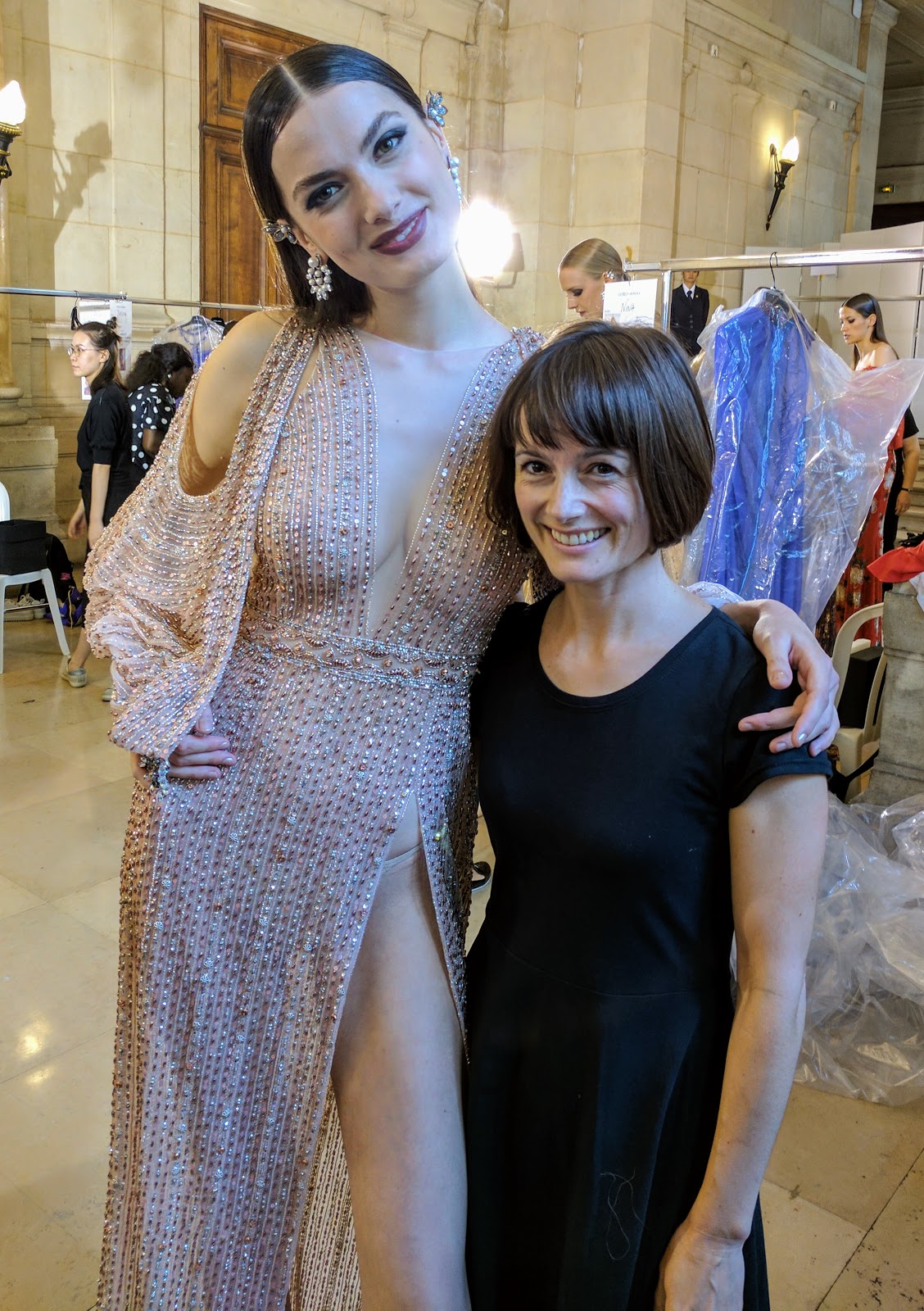 Alexandre Vauthier was our 4th show and I didn’t take any photos of the garments (here is the Swarovski-encrusted garment I put on my model, though.) The picture, above, is inside the Grand Palais with a glimpse of the partial “Eiffel Tower” that Chanel used for their show. In some cases, designers don’t permit photos behind the scenes until after the show, but in this case, I didn’t take photos because it was outrageously hot in the Grand Palais and I was hungry and thirsty and on my feet for 5 hours. I wasn’t happy enough to document the event!