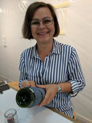 We also spent two days with instructor Sandi Keiser dyeing fabric and wool felting. On the “dyeing day” used various Japanese shibori techniques, which resulted in some gorgeous silk scarves. Below, my scarf has been initially dyed grey and then wrapped around a wine bottle (there are a few to spare in Paris!).