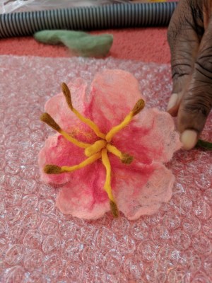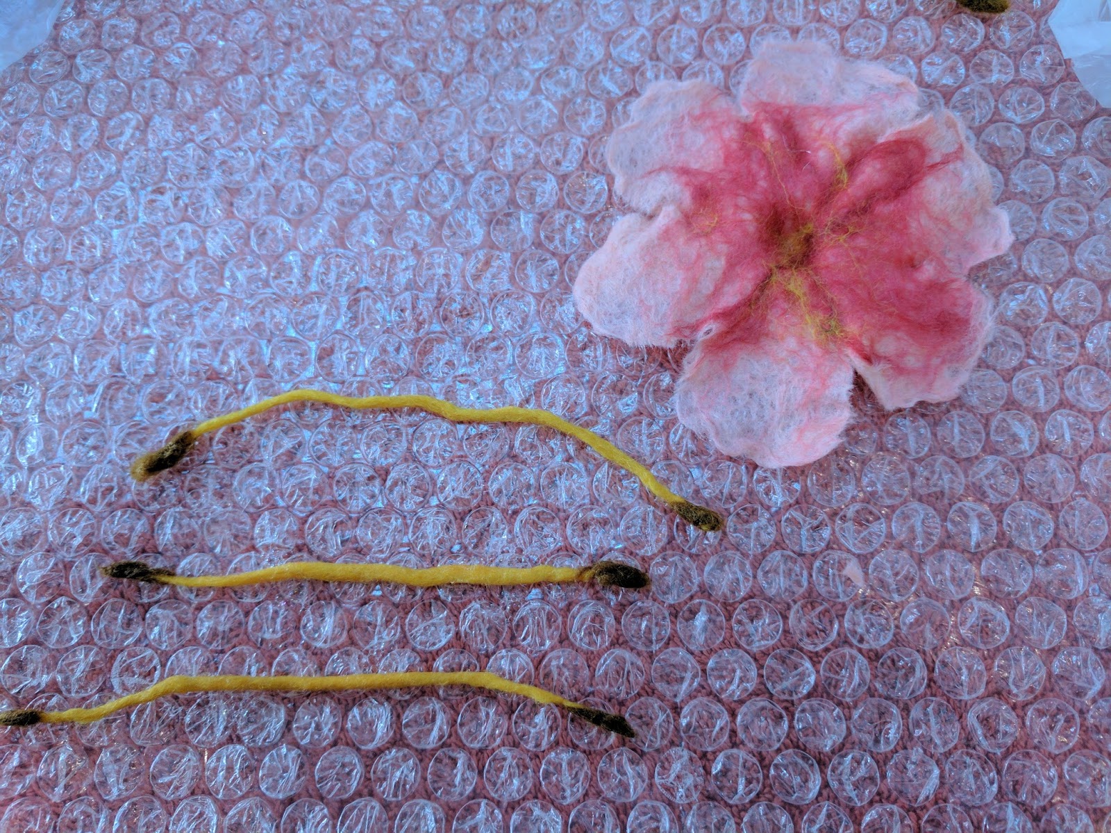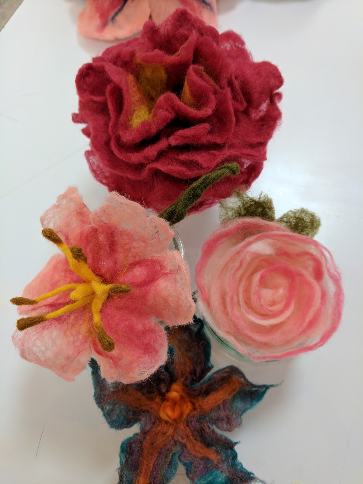 Wool felting to create flowers was day two with Sandi. Here are some in-progress photos of my first flower: