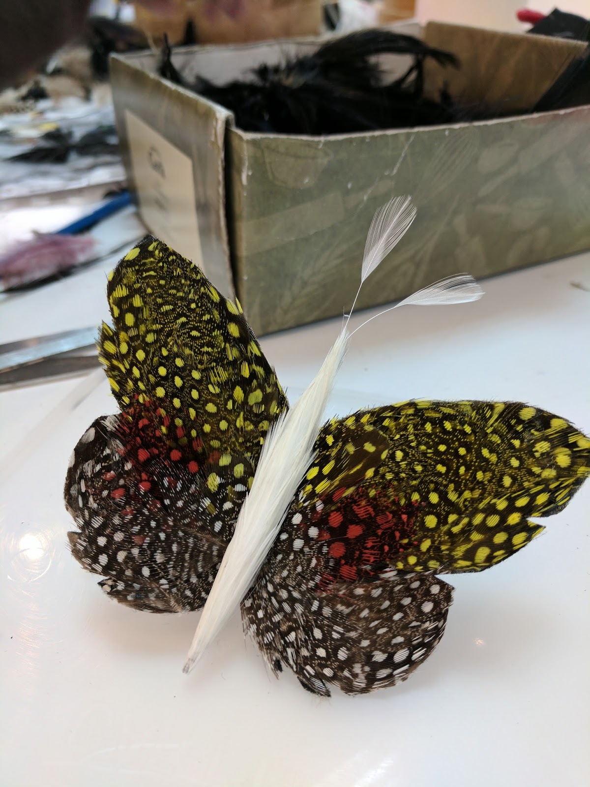 Our last “special project day” was working with Maude Ruby, a feathers expert. We created lovely butterflies! Mine was probably the least exciting, colorwise, of the group, but I’m pleased with how it turned out. Now, I need to attach this beauty to a headband!
