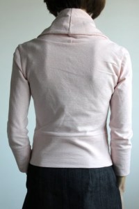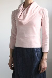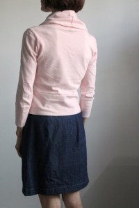 The cowls are both a mash up of Sewaholic’s Renfrew top (view C) and an elongated waistband from Seamwork’s Astoria top. I sewed the teal version first and the neckline is a bit narrow, so I slashed and spread the cowl pattern to make it a bit wider for the pink one. See, bigger!