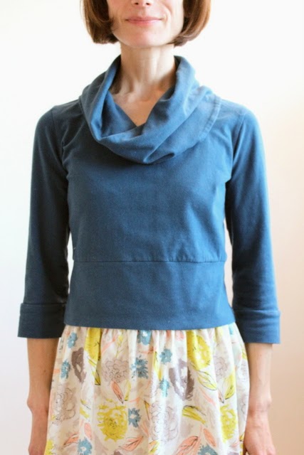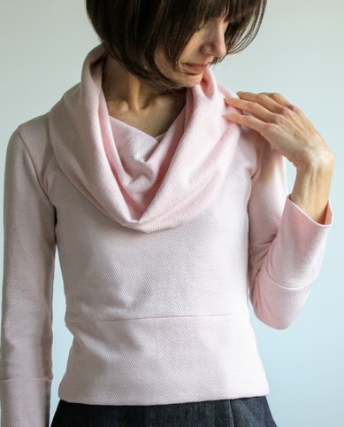 The cowls are both a mash up of Sewaholic’s Renfrew top (view C) and an elongated waistband from Seamwork’s Astoria top. I sewed the teal version first and the neckline is a bit narrow, so I slashed and spread the cowl pattern to make it a bit wider for the pink one. See, bigger!